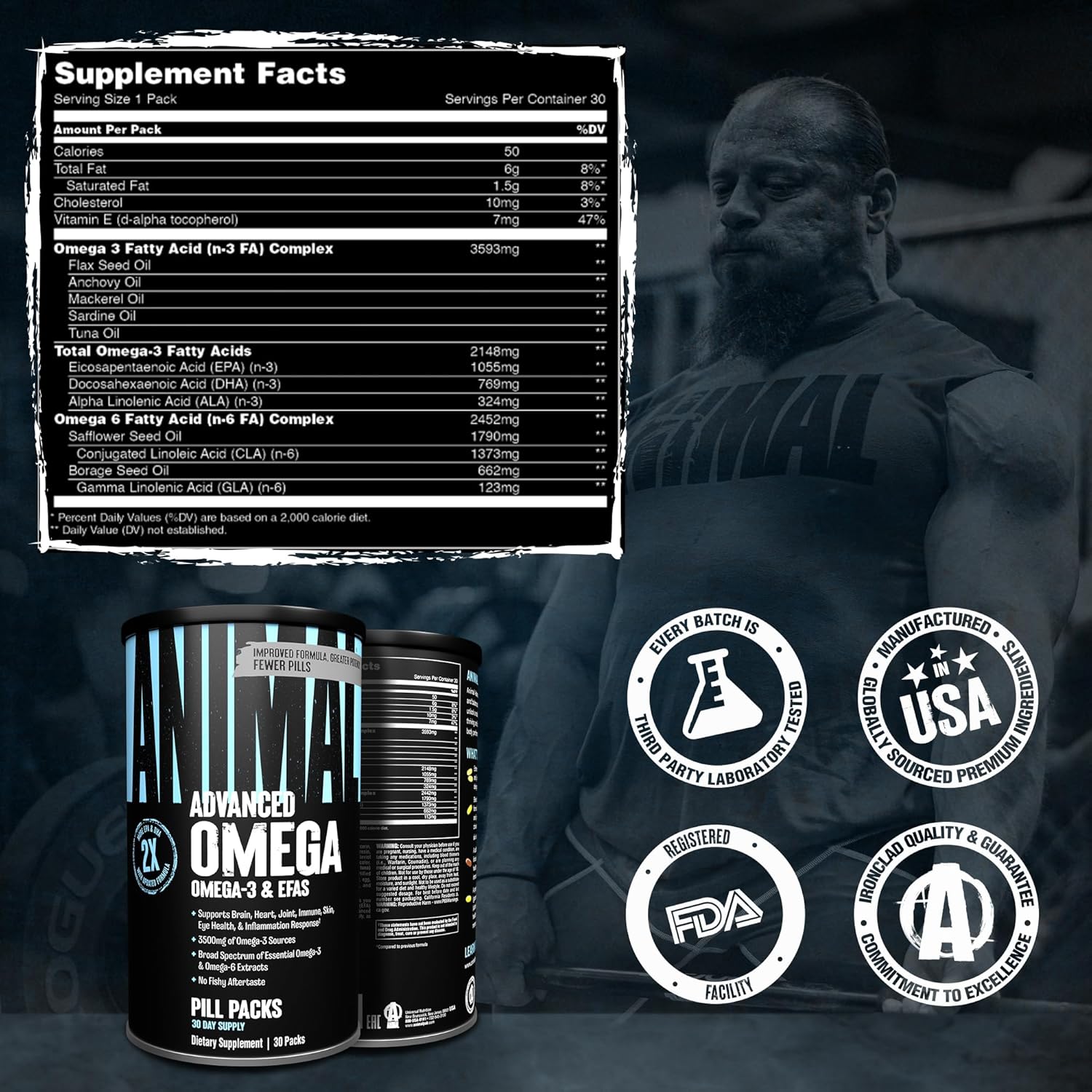 Animal Advanced Omega Supplements – 30 Individual Vitamin Packs Complex Support for Athletes Who Train Harder Trim the fat… Yeah, bodybuilders have avoided fat for years, and for good reason. But there’s a class of fats your body simply can’t function without: essential fatty acids (EFAs). Without them, you wouldn’t make gains, let alone survive. Animal Omega3 & 6 capsules take these critical fats and tailor them for the hard-training lifter, delivering a clinically dosed 2400mg omega-6 and 3500mg of omega-3 fatty acids from 10 premium marine and plant sources. These include salmon oil, anchovy, flaxseed, borage, evening primrose, and more. You get EPA DHA, CLA (conjugated linoleic acid), GLA, and ALA, a complete profile to help protect joints, support brain and metabolic function, and promote a healthy lipid profile*. Unlike many omega 3 fish oil supplement pills with fishy aftertastes, Animal’s enteric-coated soft gels are burpless, easy to swallow, and deliver more than basic omega 3 fish oil epa dha formulas. With pure omega DHA and EPA and a whole spectrum of EFAs, Animal is built for lifters, athletes, and anyone who trains with intent, so you can feel stronger, bounce back quicker, and keep pushing forward. Take one pack daily with any meal; pre or post-workout, or whenever fits your grind. Stack it with Animal Pak, Flex, or Cuts to cover every angle of your performance, recovery, and body composition goals. Manufactured in a GMP-certified US facility and rigorously third party tested for safety and potency, this omega 3 supplement for women and men delivers the high quality and unmatched results Animal is renowned for. Trusted by athletes for over 40 years, Animal continues to set the standard in sports nutrition. *Statements regarding dietary supplements have not been evaluated by the FDA and are not intended to diagnose, treat, cure, or prevent any disease or health condition