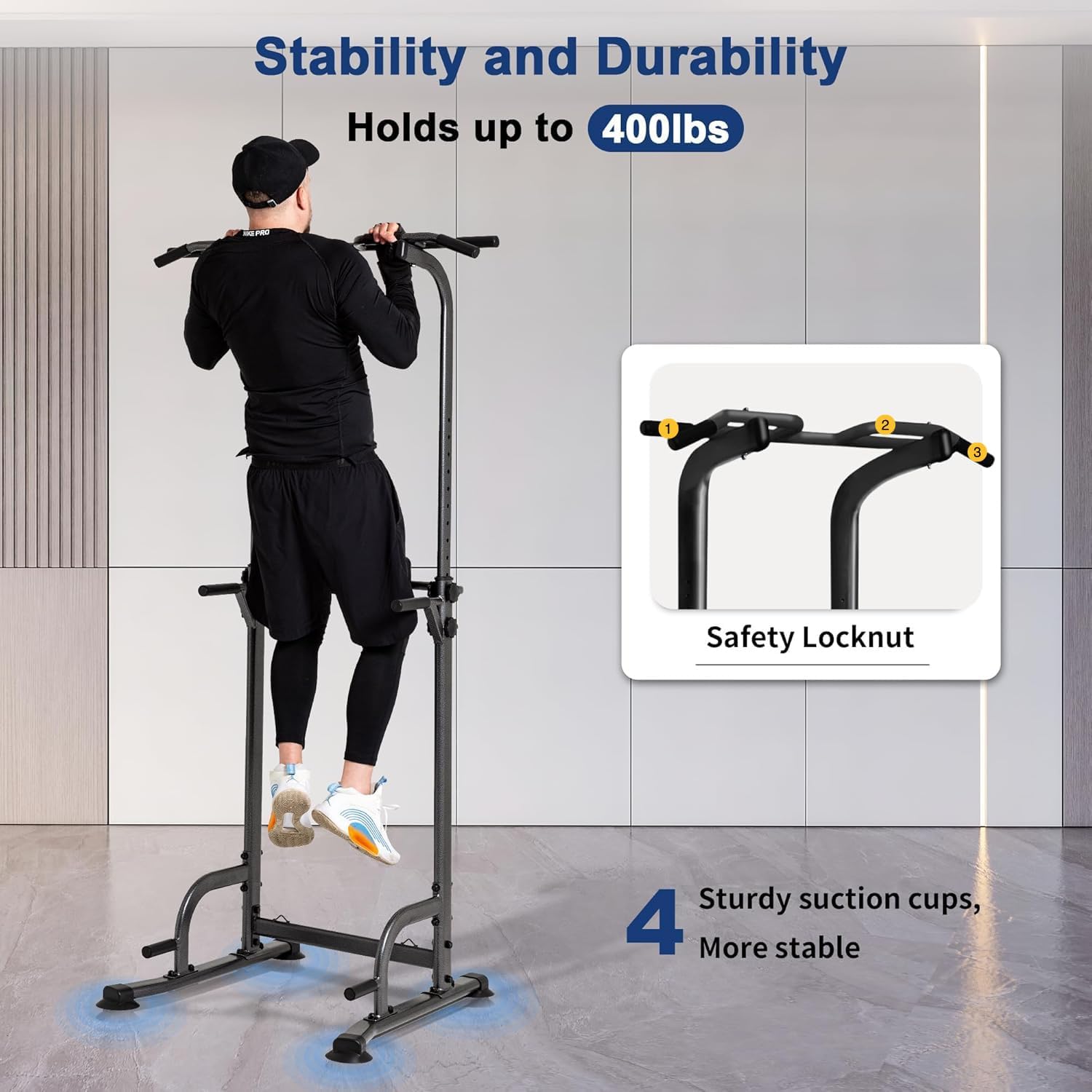 【Sturdy and Reliable】High durability frame of 60mm in this pull up station—with every component manufactured to strict standards, including high-ductility steel, high-strength bolts, and high-seal welds. With the frame firmly supporting the whole body with less shaking and shaking.Fixed bolts adopt a W-lock design, and the uprights are reinforced with dual bolts for enhanced safety. The base features 4 suction cups for tight ground contact that won’t scratch your floors,effectively reducing front-to-back wobble during use, supporting a stress-free workout experience on this power tower.