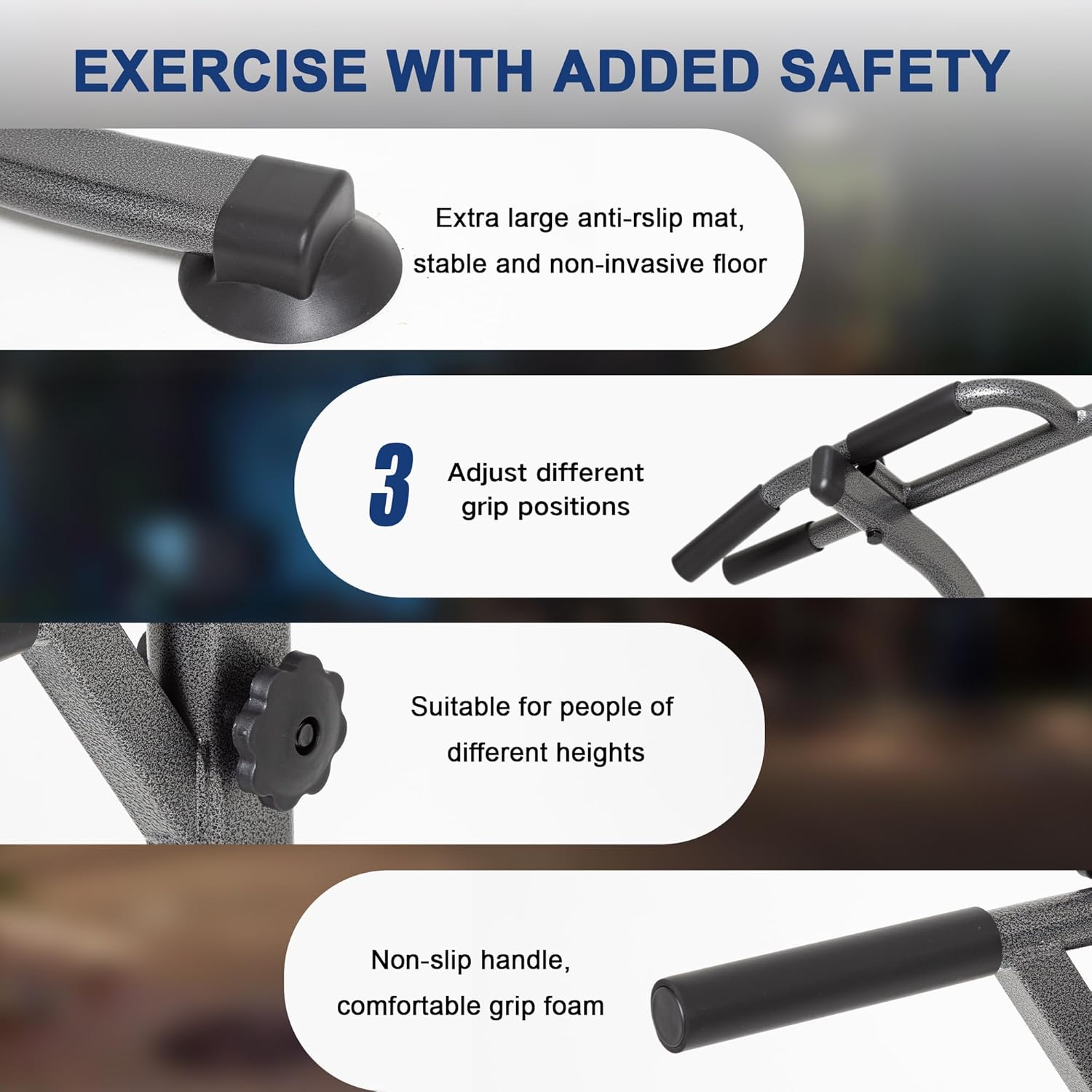 【3 Adjustable Grip Positions】This pull up dip station supports 3 different grip styles to help target specific muscle groups. By switching between these professional-grade grips, you can effectively work your back, arms, or shoulders while easily adjusting the difficulty level of your workout.The ergonomically designed grips provide comfortable and secure handling during intense exercise sessions.