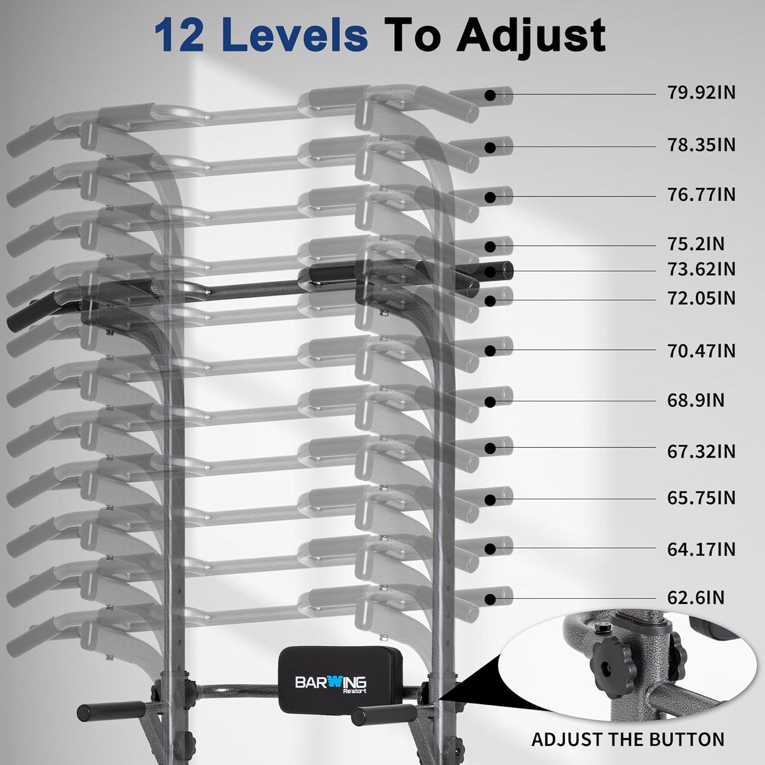 【12-Level Height-Adjustable Power Tower】The dip station features a height range of 62.6 to 79.92 inches, and the free adjustment height design is easier to serve different height groups.Whether you’re tall or petite, this power tower adapts to your needs, providing comfortable exercise positions for the whole family.The power tower is suitable for the whole family to exercise,making it an ideal choice for home workouts.