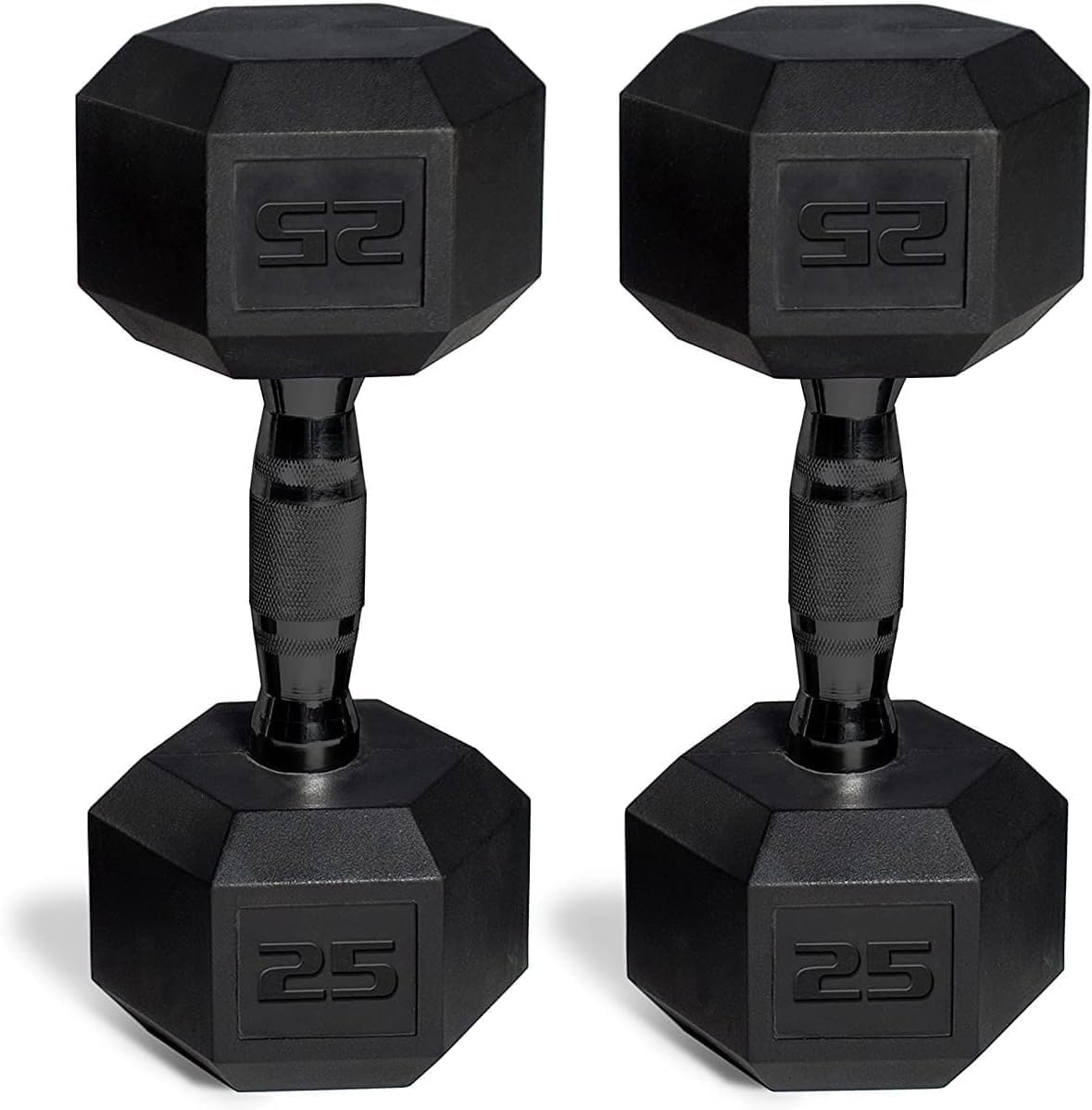 FEATURES – Includes 25LB pair of coated dumbbells with Black handles; Hex-shaped ends prevent rolling; Medium-depth knurling on the handle provides essential grip and security during use; Comfort coated handle adds a stylish element to your home gym; Dumbbell end coating is extremely durable