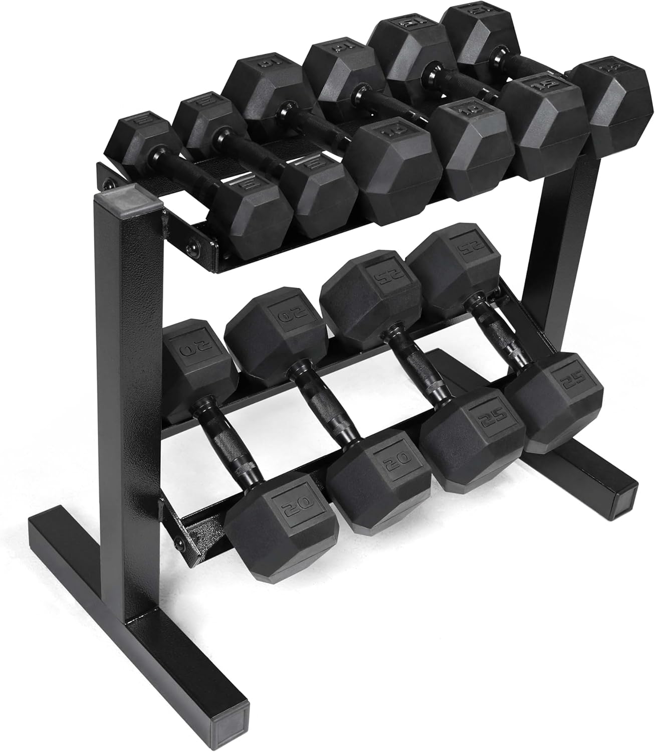 SET INCLUDES – A pair of 5-pound, 10-pound, 15-pound, 20-pound, and 25-pound rubber hex dumbbells with a black Two Tier dumbbell rack to store the weights. E-commerce packaging. This set ships in multiple boxes.