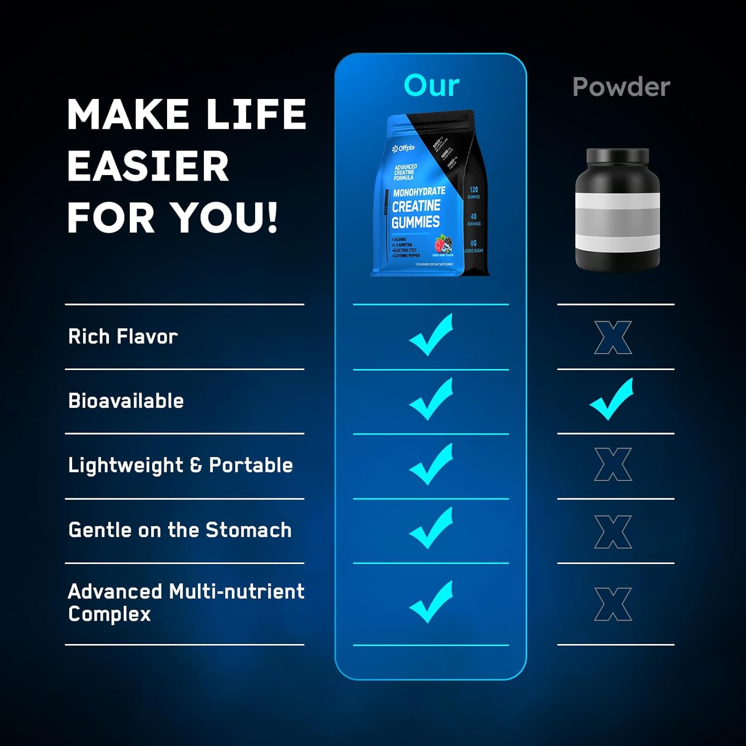 TRAVEL-READY CREATINE PACKETS:Each daily serving (3 gummies) is hygienically sealed in its own creatine travel packets, locking in potency and flavor. With 40 creatine individual packets (120 gummies total), enjoy month-long freshness without bulk.Compact and travel-ready, they fit seamlessly into gym bags, luggage, or your desk drawer for instant fuel during hectic days.