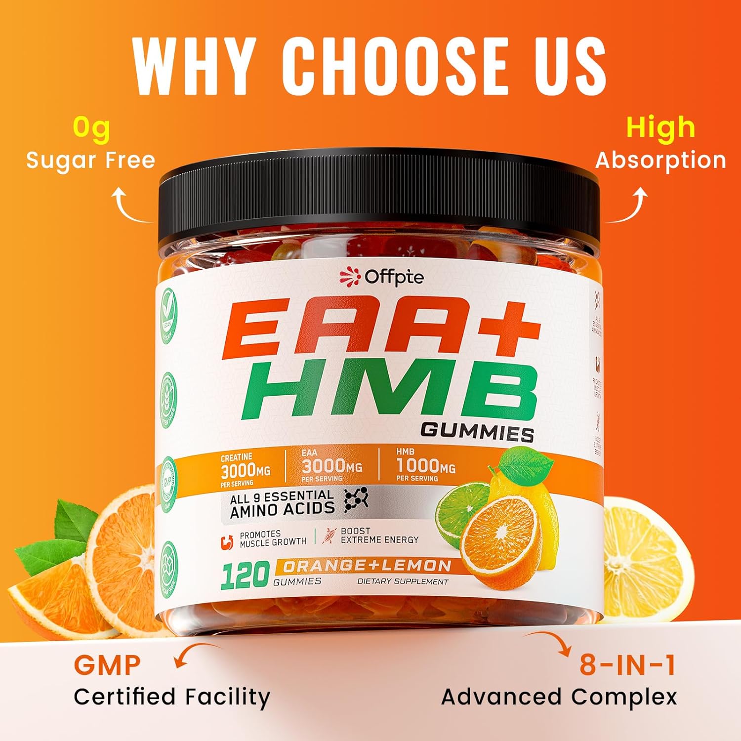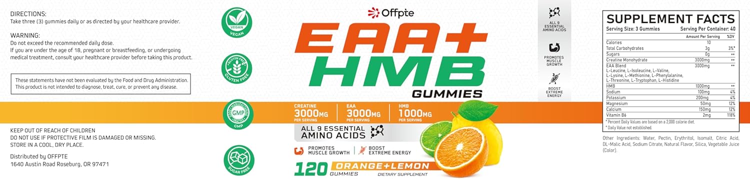 CONVENIENT AND PORTABLE:Enjoy the refreshing natural taste of orange-lemon without added sugars. Our EAA + HMB + Creatine gummies are low-calorie and made with pectin, delivering a more enjoyable chewy experience compared to traditional capsules and tablets. Perfect for both men and women, these gummies are ideal to take pre-workouts or post-workout, helping you achieve your fitness goals