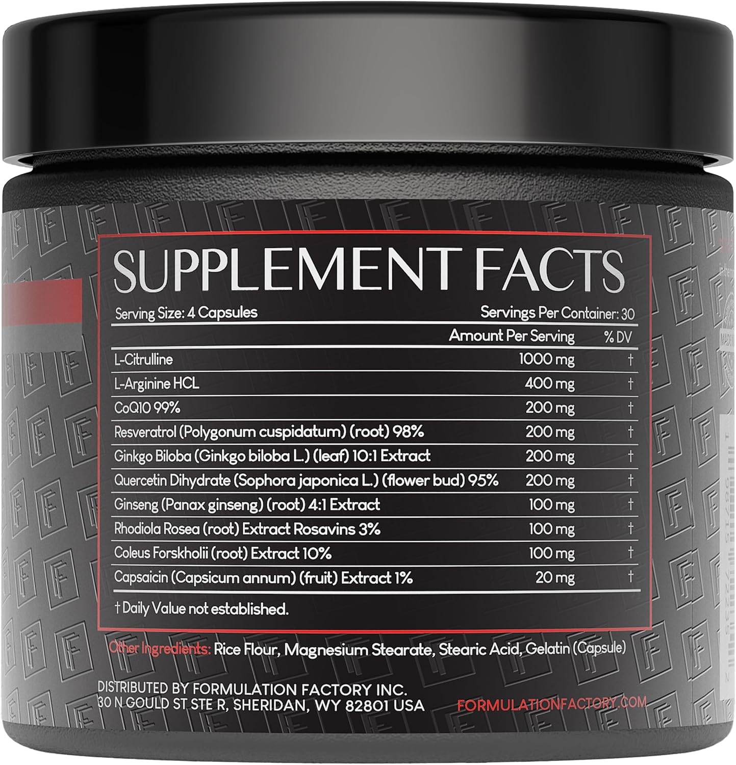 10-IN-1 METABOLIC MAXIMIZER – L-Citrulline, L-Arginine, CoQ10, Resveratrol, Ginseng, Ginkgo Biloba, Rhodiola, Quercetin, Forskolin, Capsaicin. A powerhouse blend for circulation and stamina.