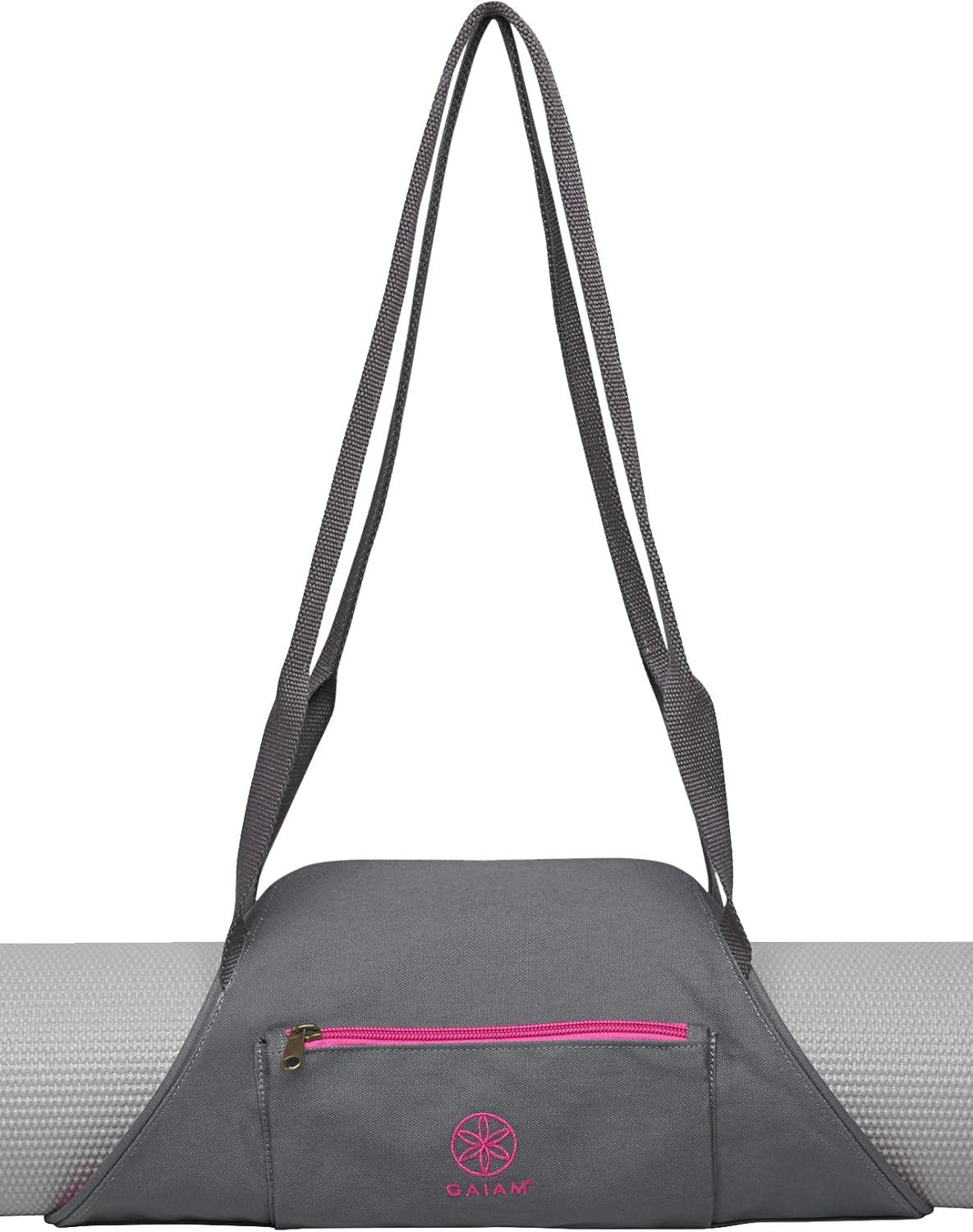 Gaiam Pro On-The-Go Mat Bag/h3> The perfect combination of fashion and function, the Gaiam On-The-Go Mat Bag makes it easier to transport your yoga mat to and from practice. Adjustable to fit any size mat and a streamlined design with exterior zip pocket to hold your essentials. Travel with ease. Travel with Gaiam. Features: Streamlined design for easy transport Exterior expandable zip pocket Roomy enough to fit most mat sizes Material: 100% cotton with a 100% polyester lining. Care Instructions: Wash in the gentle cycle with cold water. Lay flat to dry.