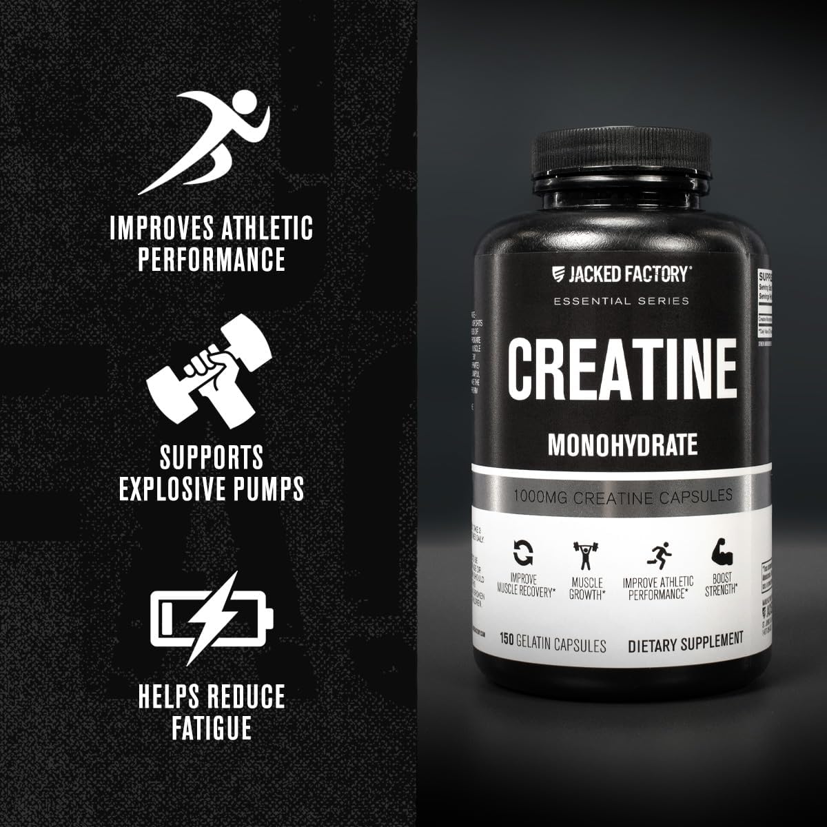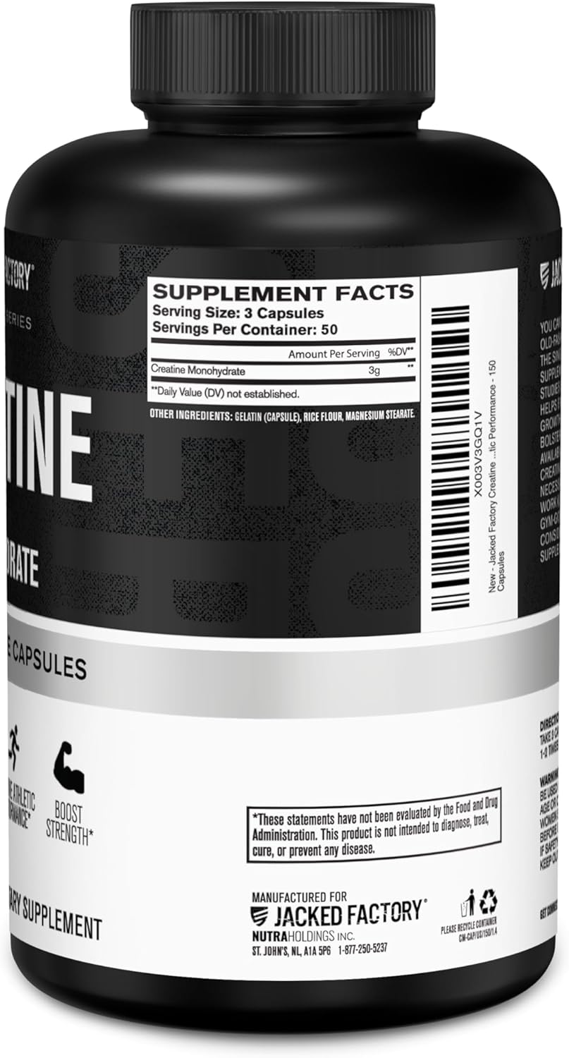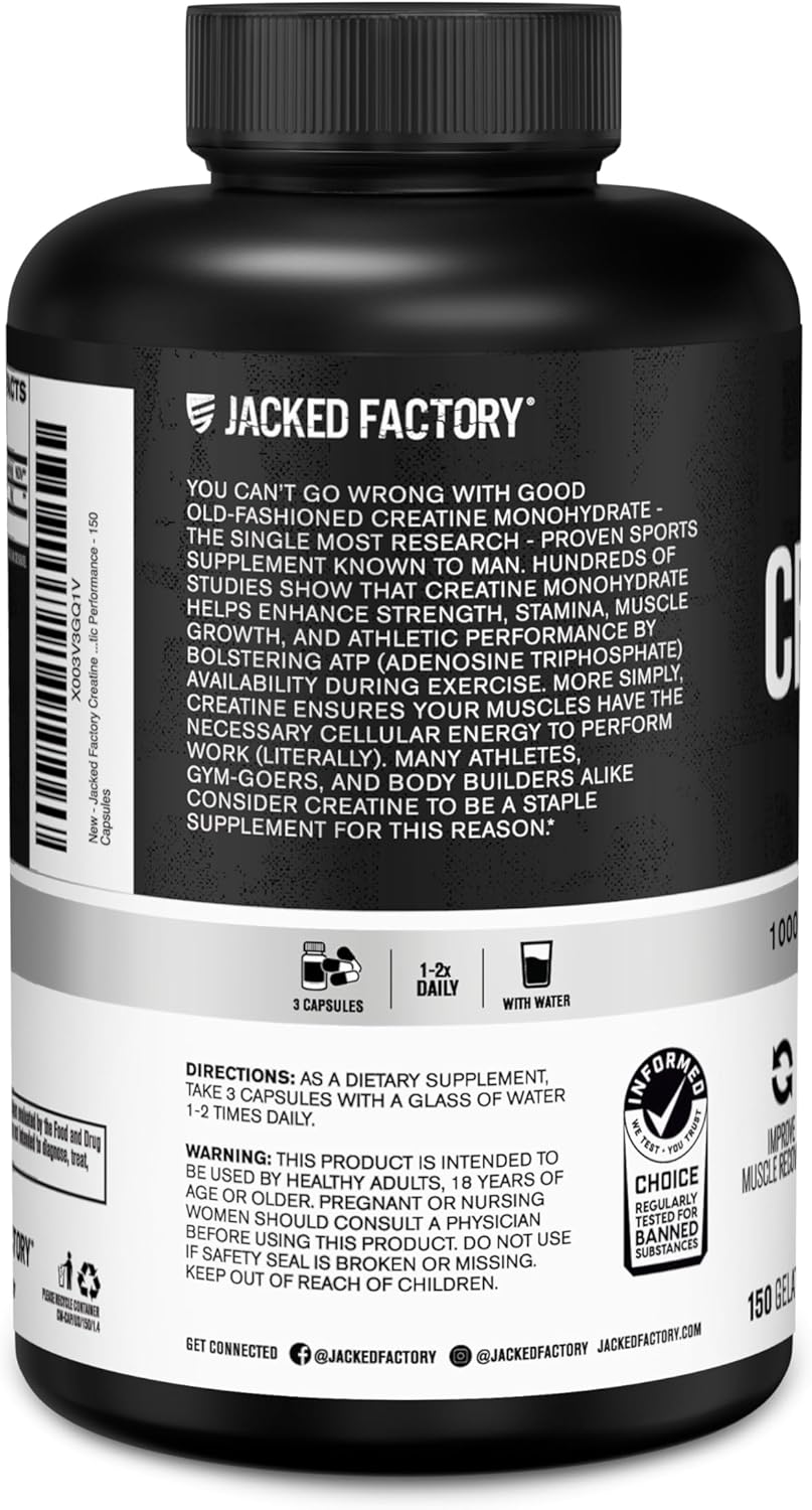 Jacked Factory Creatine Monohydrate Capsules – Creatine Pills for Muscle Growth, Increased Strength, Enhanced Energy Output and Improved Athletic Performance – 150 Capsules
