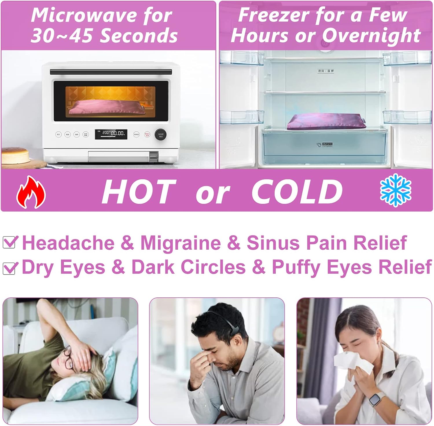 Hot & Cold Compress: Microwave it for 30 seconds. eye sinus pillows weighted deliver moist heat and gentle pressure to relieve dry eyes, headaches, migraines, and sinus pain. Freezer for a few hours or overnight, the satin eye pillow will relieve your dark circles and puffy eyes, refreshing tired eyes strained by study or work.