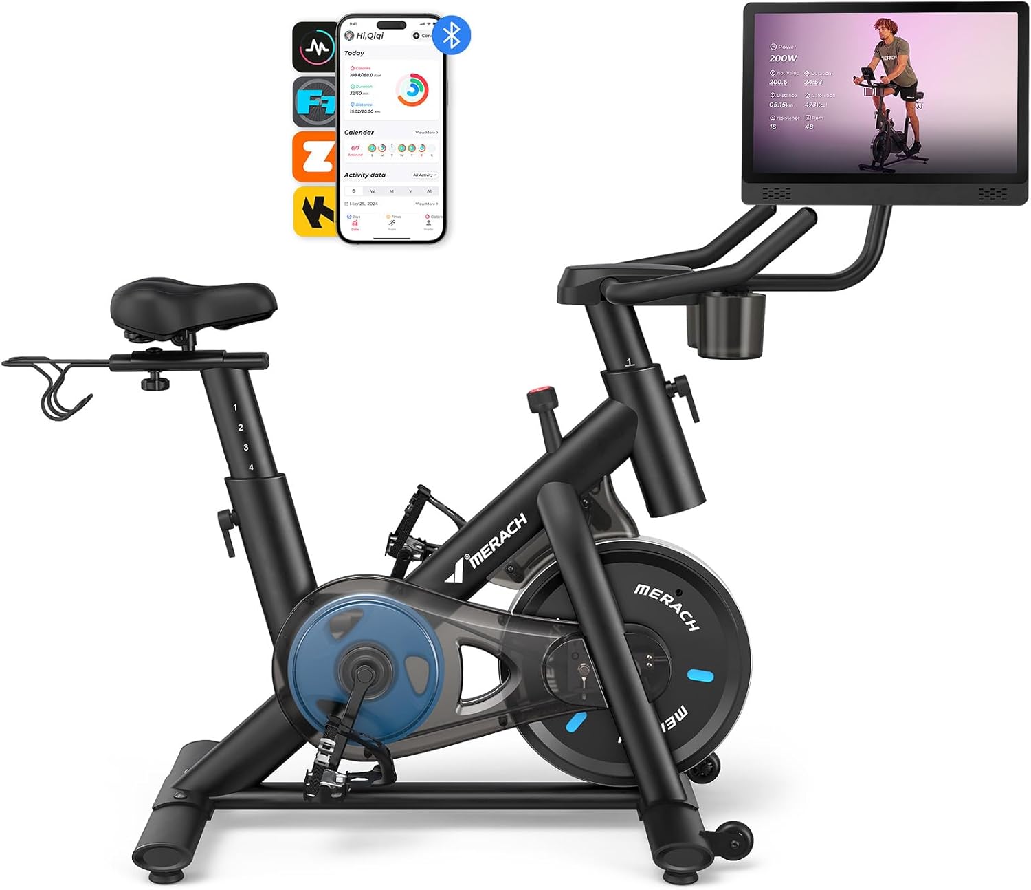 2025 Upgrade New Version: Merach exercise bike now featuring a 90° horizontal & 60° vertically adjustable screen, also can project movies or courses from your phone onto the screen. Perfect for cycling, floor workouts and partner workouts. Whether you’re pushing through a HIIT session or enjoying a scenic ride, you‘ll engage with larger visuals, turning every workout into entertainment