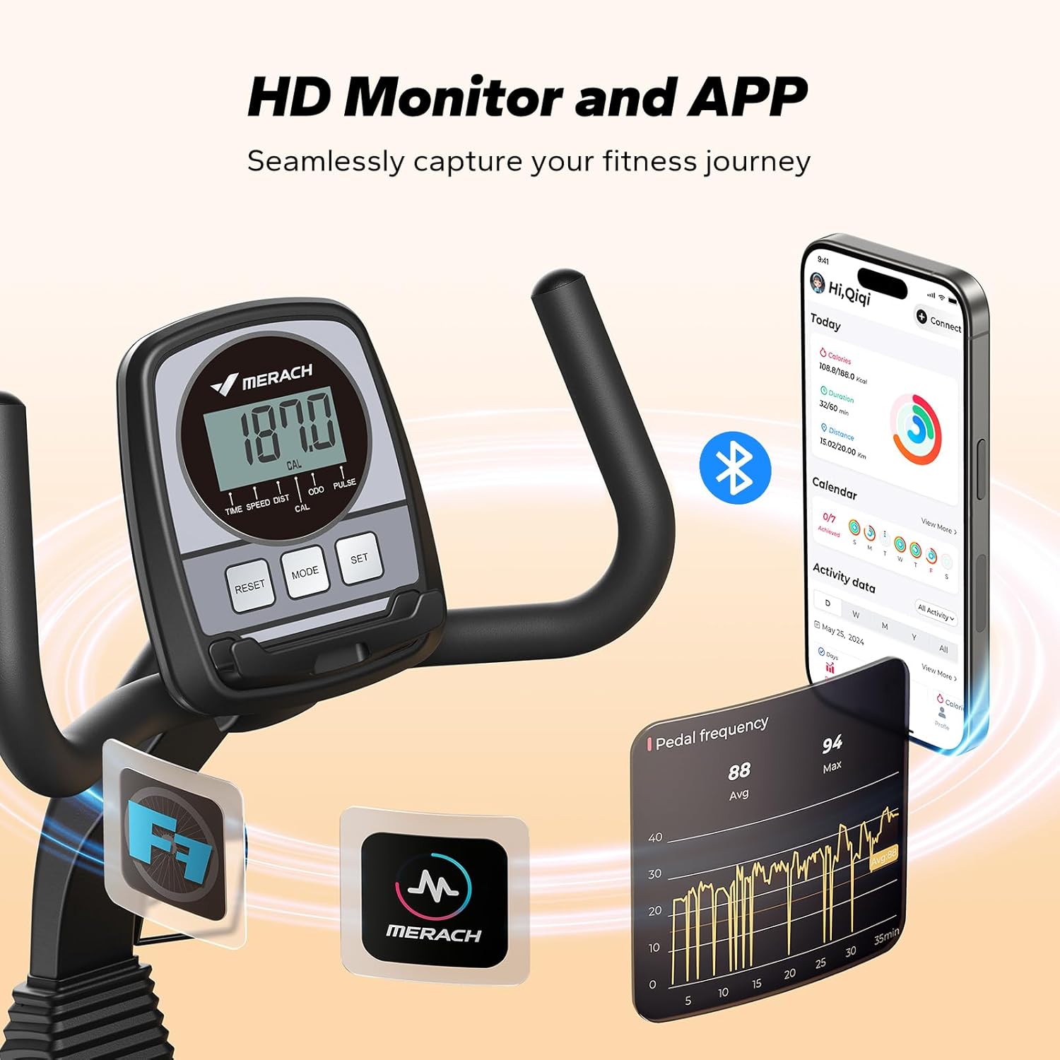 【 MERACH Self-Developed App 】 Syncing with your Bluetooth exercise bike. Track real-time stats like distance, time, calories, and heart rate. Plus, the FantomFite app turns cycling into a fun game experience!