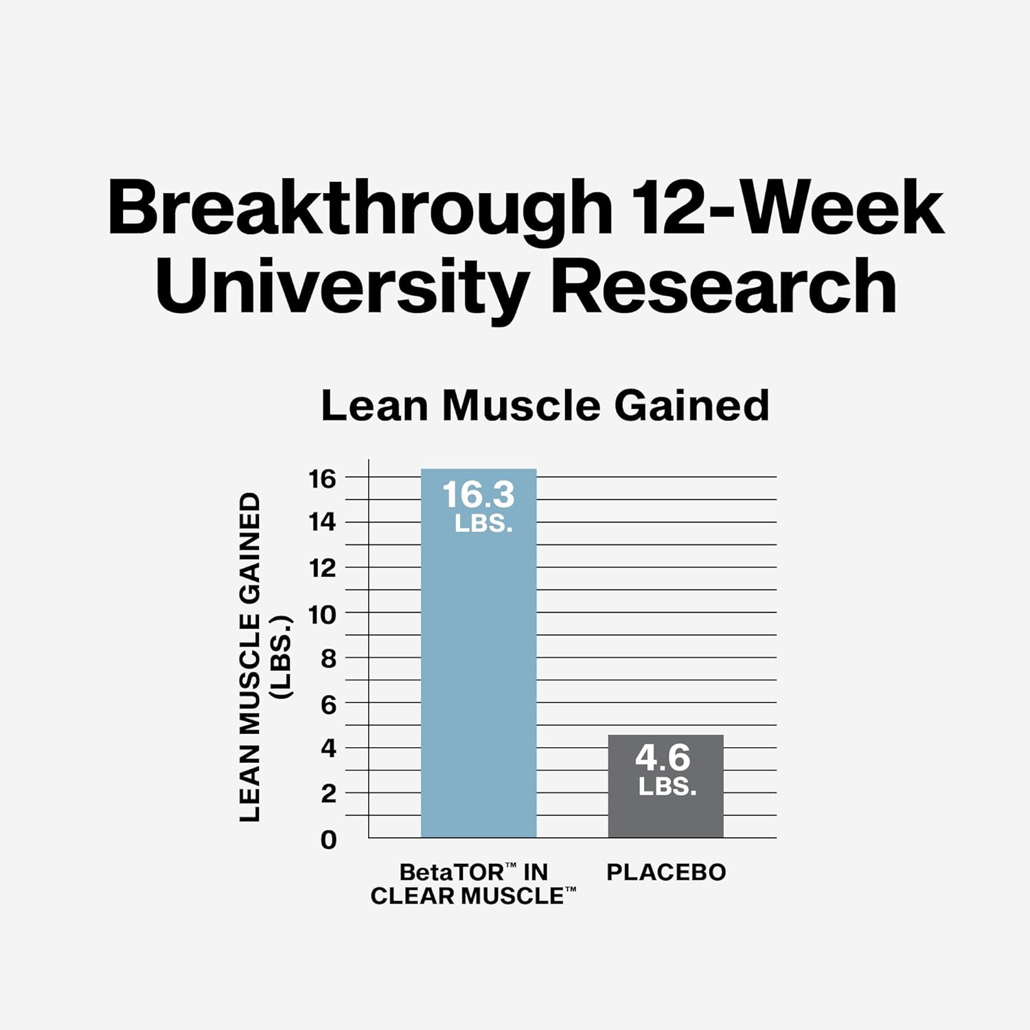 Massive Gains in Lean Muscle: MuscleTech Clear Muscle contains a compound to help increase protein synthesis. Users gained 16.3 lbs. of muscle in 12 weeks, significantly outperforming the placebo group. 1 capsule per serving. 42 capsules per container.