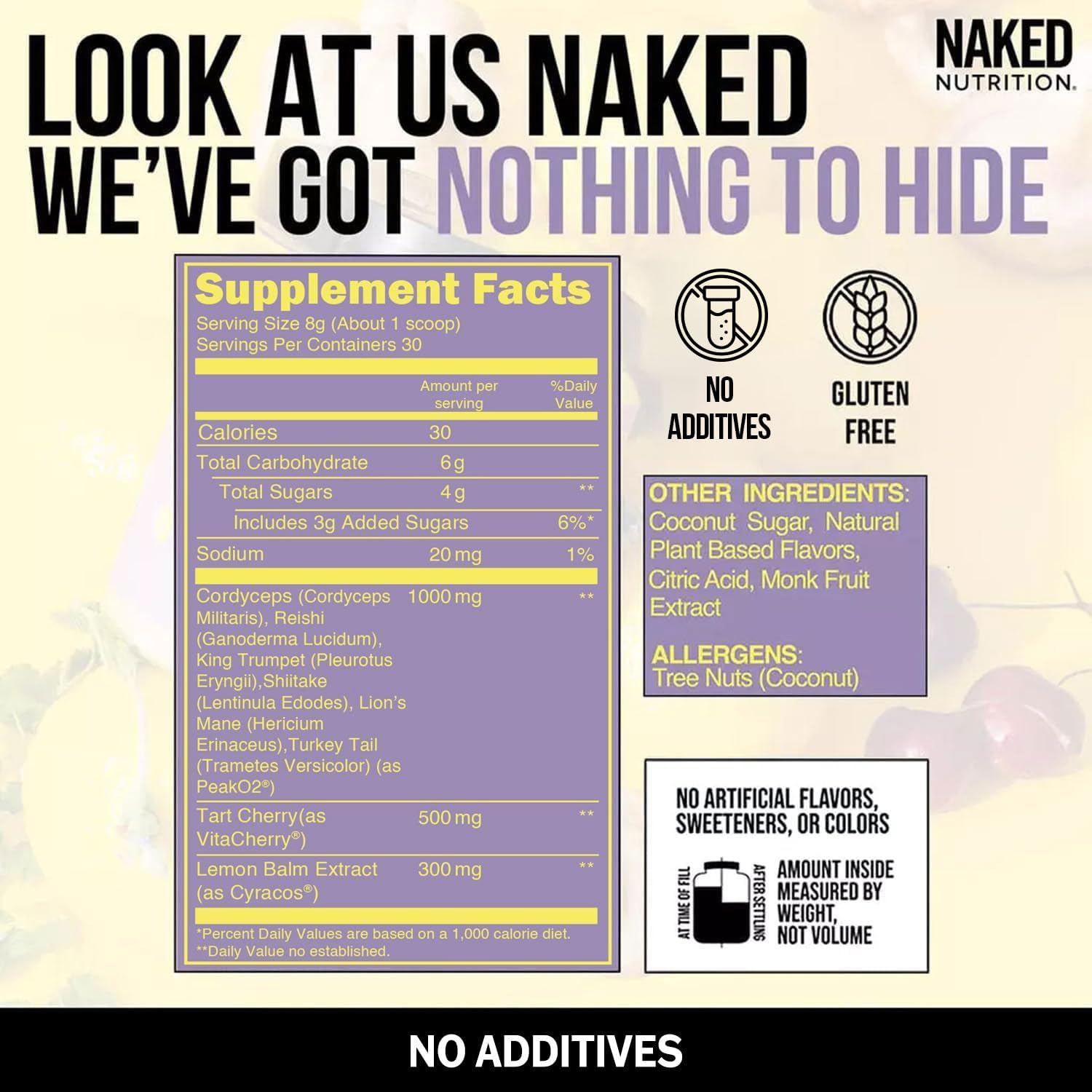 ADAPTOGEN POWDER: Naked Recovery is a premium recovery powder formulated with six adaptogenic mushrooms grown in the U.S., tart cherries, and lemon balm to support post-workout recovery and promote general health.