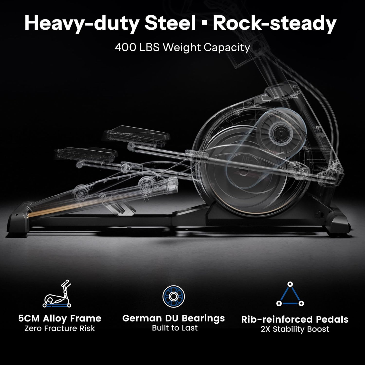 400 LBS Weight Capacity: Niceday elliptical exercise machine features an upgraded 5CM-thick alloy frame with zero fracture risk; The rib-reinforced pedal boosts 2X stability, ensuring no movement even for heavyweight users, and guaranteeing safe exercise with no worries