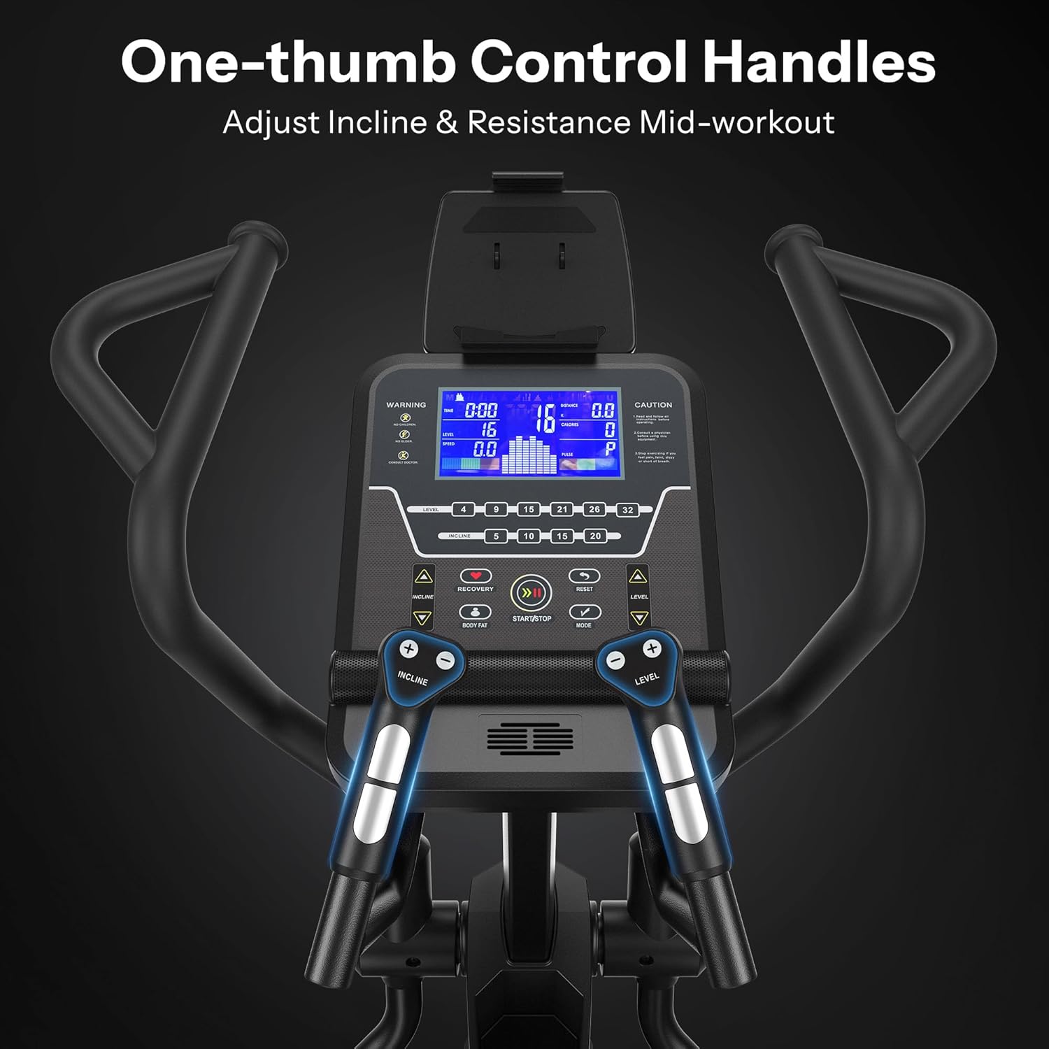 20IN Large Stride: The ergonomic front-mounted flywheel ensures the movement trajectory is more in line with natural gait; the four-link drive system distributes force evenly, protecting the knees from impact; Users up to 6’5″ can exercise with zero-impact comfort