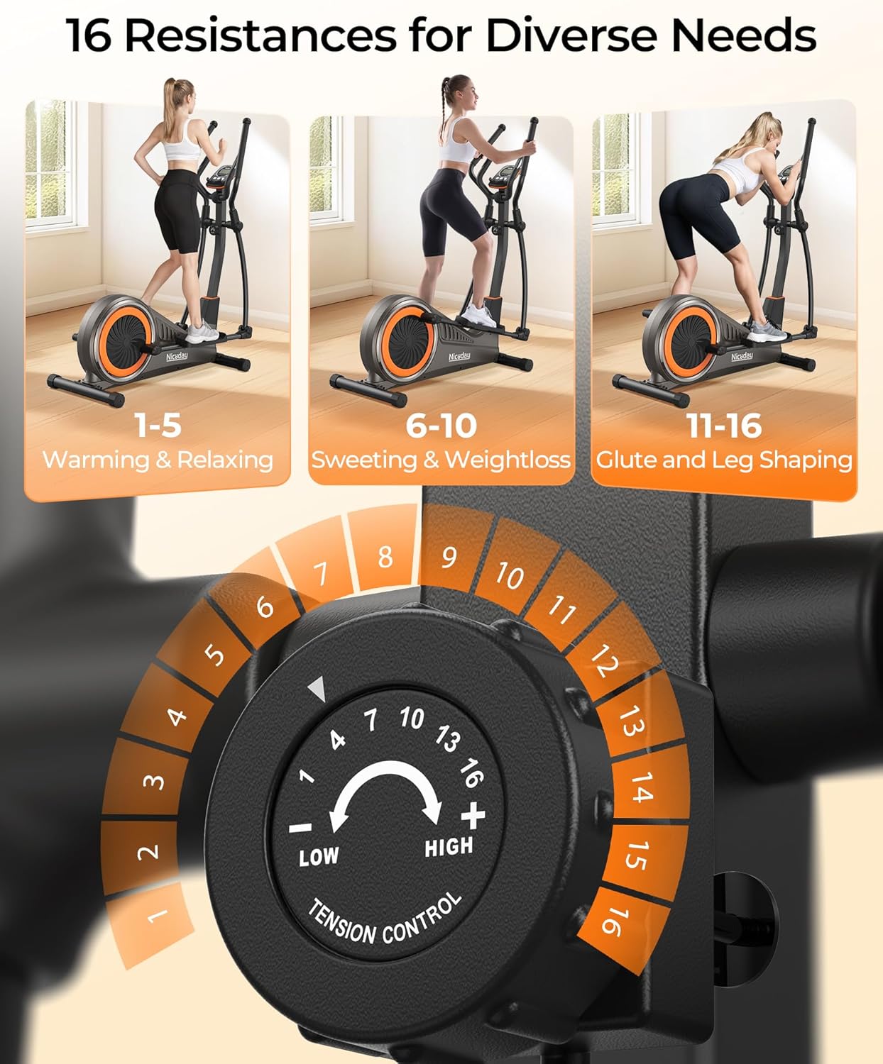 Specification: Niceday Elliptical Machine, Elliptical Exercise Machine for Home with Hyper-Quiet Magnetic Driving System, Elliptical Trainer with 15.5IN-20IN Stride, 16 Resistance Levels, 500LBS Loading Capacity