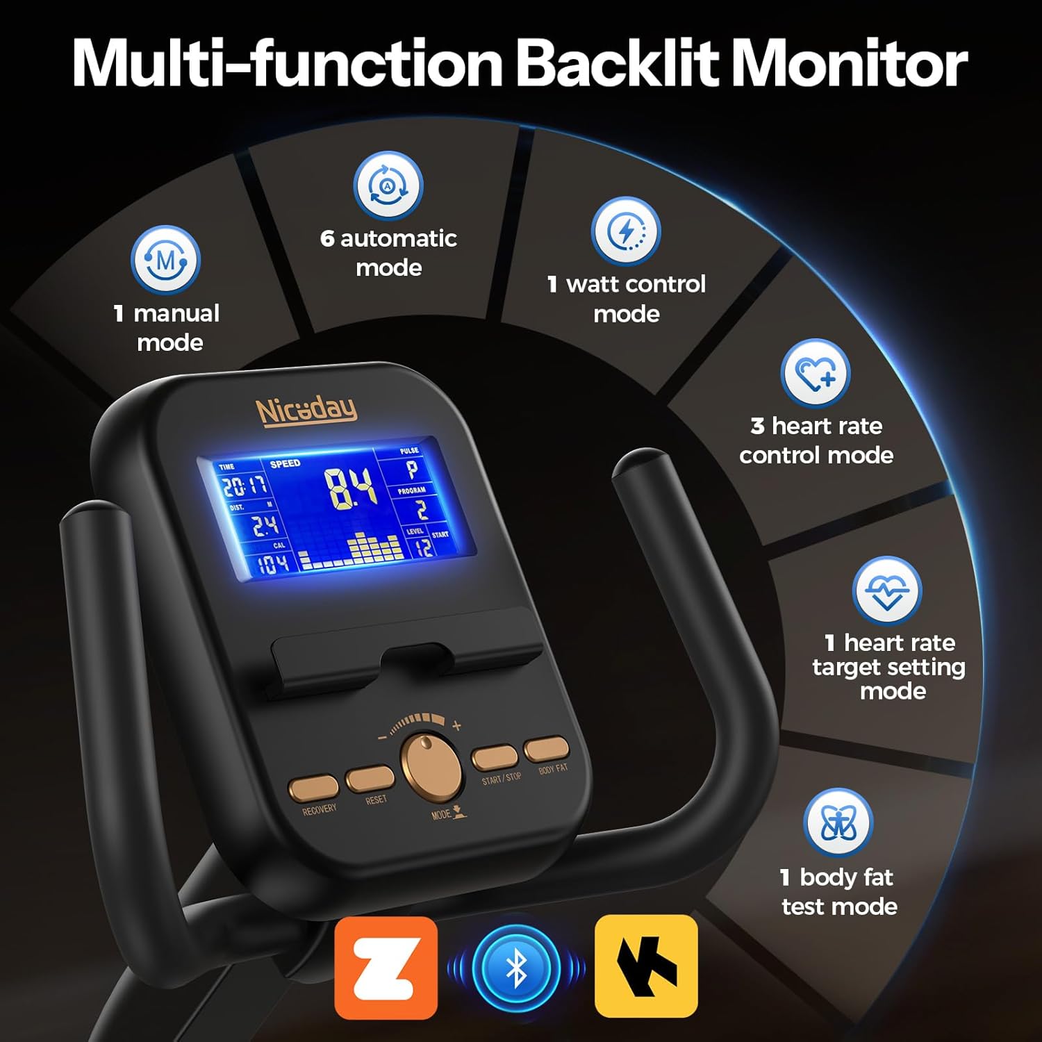 【Multi-function Backlit Monitor】Niceday recumbent exercise bike features upgraded backlit monitor, ensuring clear readability even during nighttime workouts; 13 built-in programs tailor to diverse fitness goals; Integrated with Kinomap & Z-wift apps adds extra enjoyment to exercise routine