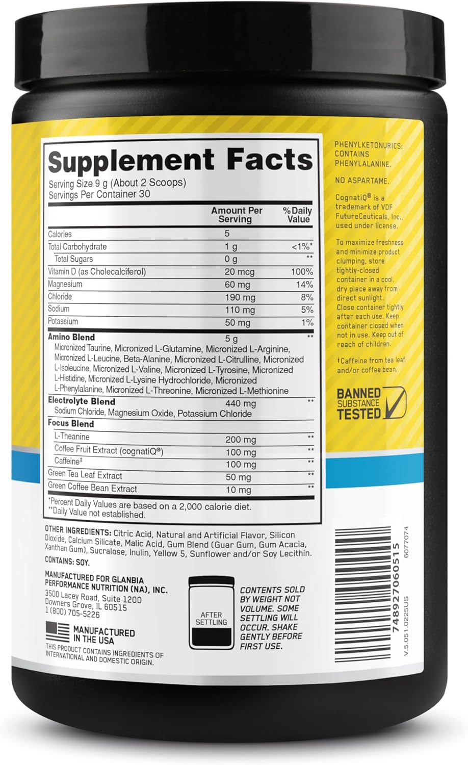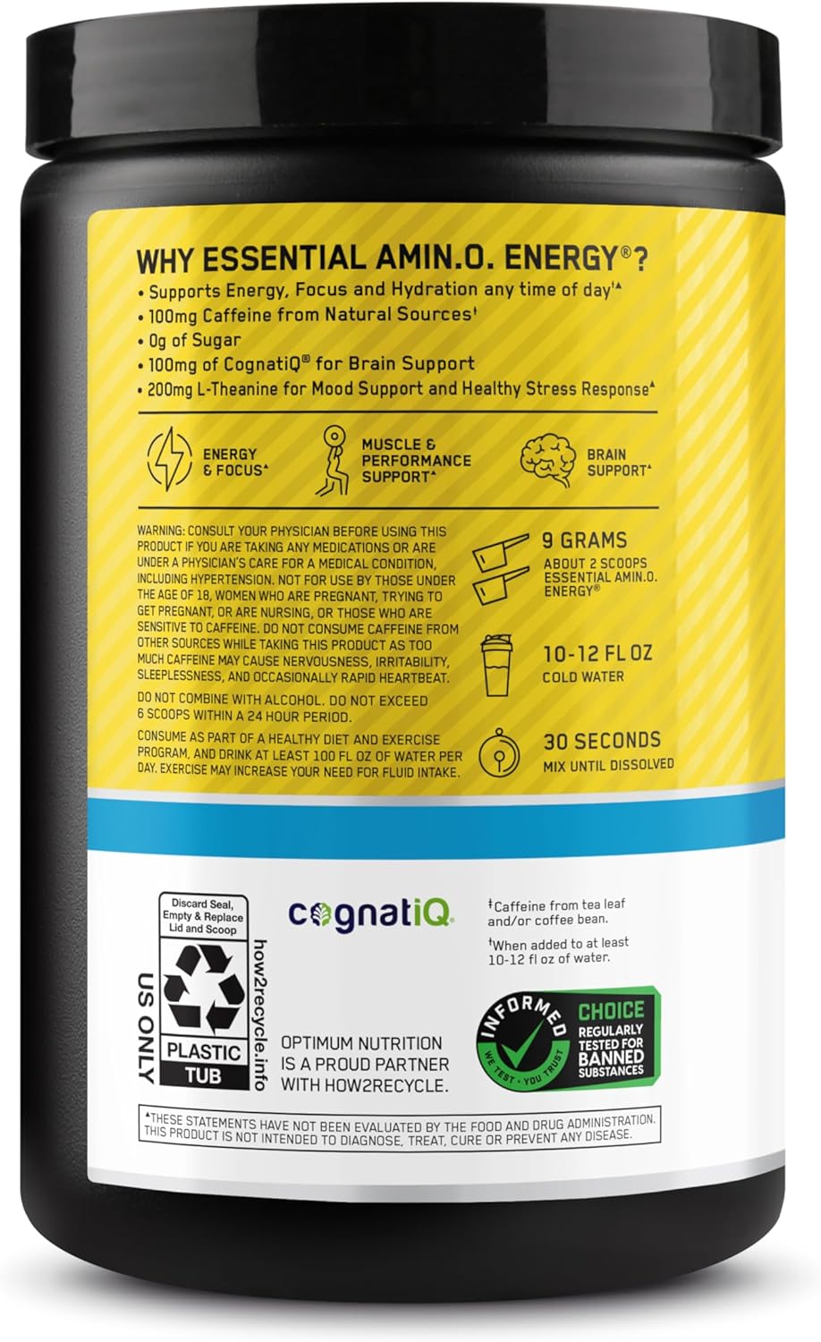 Reach for Optimum Nutrition Amino Energy Plus Electrolytes Energy Drink Powder anytime you need a boost of energy, muscle recovery and electrolyte support, whether you’re lifting, running, biking, hiking, playing team sports, or just running your daily errands. Each two-scoop serving of this anytime energy powder contains 100mg of caffeine from natural sources to support energy and focus, 5g of essential amino acids – including BCAAs – to aid muscle recovery, and electrolytes to replenish those lost in sweat and boost hydration. Use as a pre-workout powder, postworkout recovery drink, or use this energy drink mix anytime you need a morning or afternoon pick-me-up. With zero sugar and only 5 calories per serving, it’s a healthier and more functional option than sugary energy drinks. This 10.5-ounce package contains 30 servings of electrolyte powder in a delicious Pineapple Twist flavor. Optimum Nutrition Amino Energy and Electrolyte Drink Mix offers the same amino blend as our regular Amino Energy Drink Powder with the addition of electrolytes such as potassium, sodium and magnesium to help support muscle function and fluid balance.