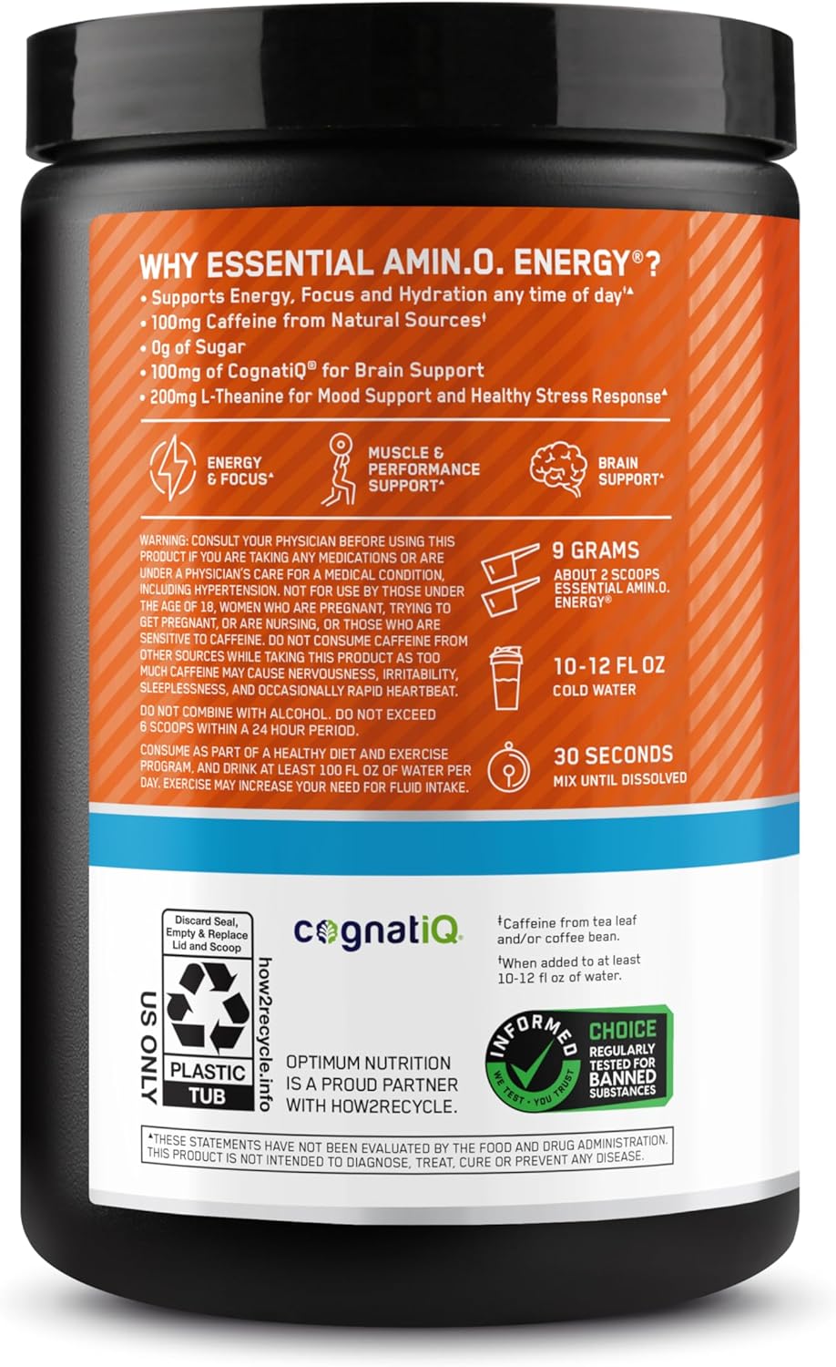 Reach for Optimum Nutrition Amino Energy Plus Electrolytes Energy Drink Powder anytime you need a boost of energy, muscle recovery and electrolyte support, whether you’re lifting, running, biking, hiking, playing team sports, or just running your daily errands. Each two-scoop serving of this anytime energy powder contains 100mg of caffeine from natural sources to support energy and focus, 5g of essential amino acids – including BCAAs – to aid muscle recovery, and electrolytes to replenish those lost in sweat and boost hydration. Use as a pre-workout powder, postworkout recovery drink, or use this energy drink mix anytime you need a morning or afternoon pick-me-up. With zero sugar and only 5 calories per serving, it’s a healthier and more functional option than sugary energy drinks. This 10.5-ounce package contains 30 servings of electrolyte powder in a delicious Tangerine Wave flavor. Optimum Nutrition Amino Energy and Electrolyte Drink Mix offers the same amino blend as our regular Amino Energy Drink Powder with the addition of electrolytes such as potassium, sodium and magnesium to help support muscle function and fluid balance.