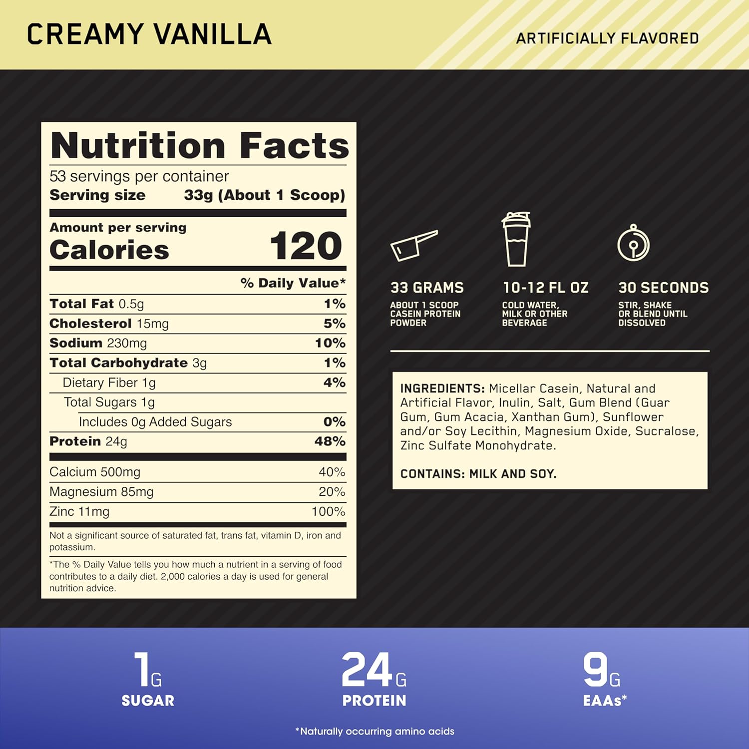 Optimum Nutrition Gold Standard 100% Micellar Casein Protein Powder helps support muscle recovery. Made with micellar casein, this protein shake powder ensures that you’re getting high quality protein with every serving. With nearly 9 grams of naturally occurring Essential Amino Acids per serving, this protein powder drink supports recovery, making it ideal for use between meals and before bedtime. Each serving of this delicious Creamy Vanilla-flavored powder is an excellent source of zinc, magnesium and calcium and provides 24 grams of protein. Optimum Nutrition powder mixes easily using a shaker cup or blended in a smoothie. There are 53 servings in this 3.86 pound container. Gold Standard 100% Casein from Optimum Nutrition, the World’s #1 Sports Nutrition Brand.* *Source Euromonitor International Limited; Consumer Health 2023 Edition, Sports Nutrition category, %retail value shares, 2022 data.