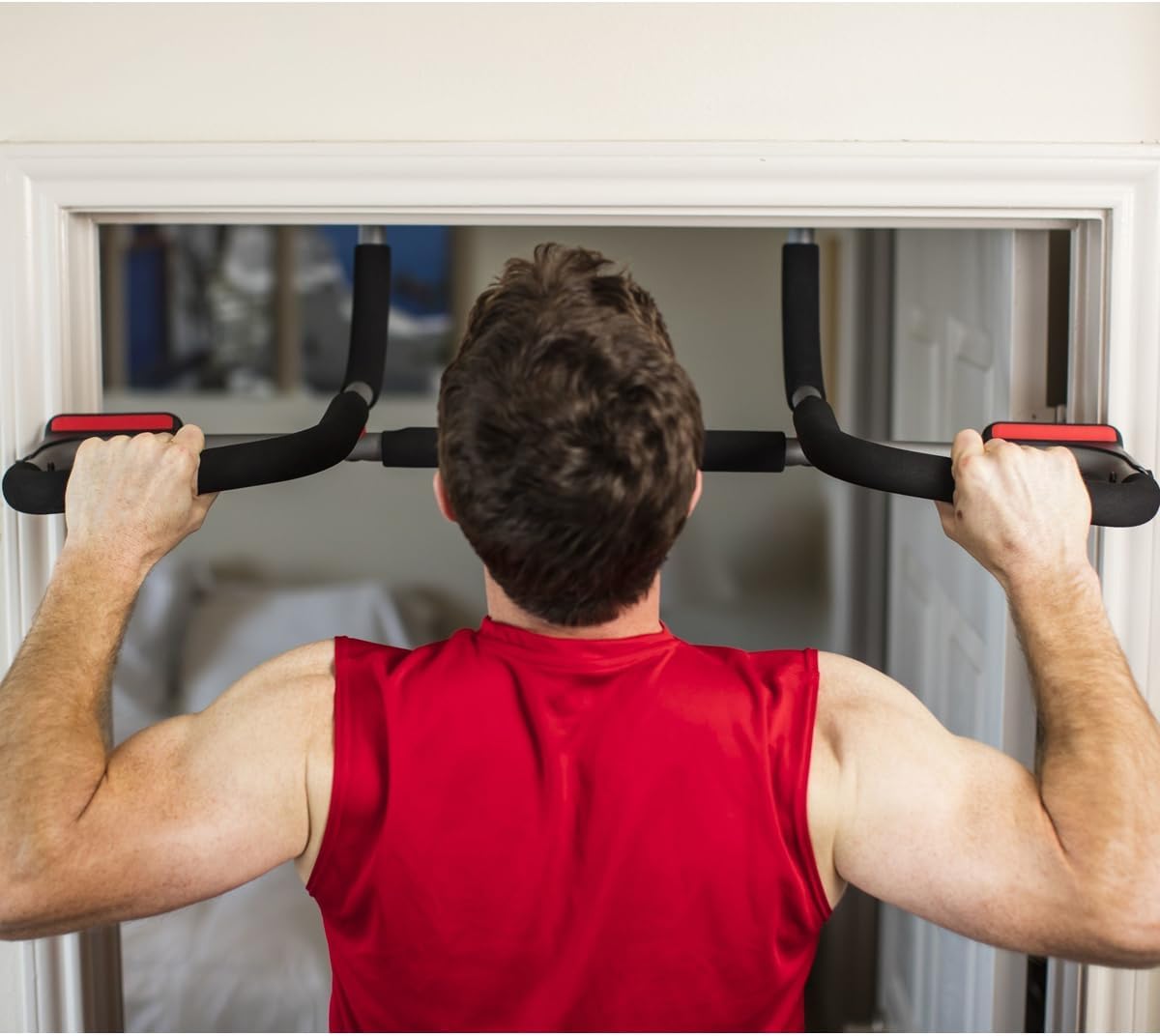Wide grip curved ergonomic handles offer three grip options for wide, close, and hammer grip pullups; padded handles ensure comfort for sit-ups, push-ups, and dips