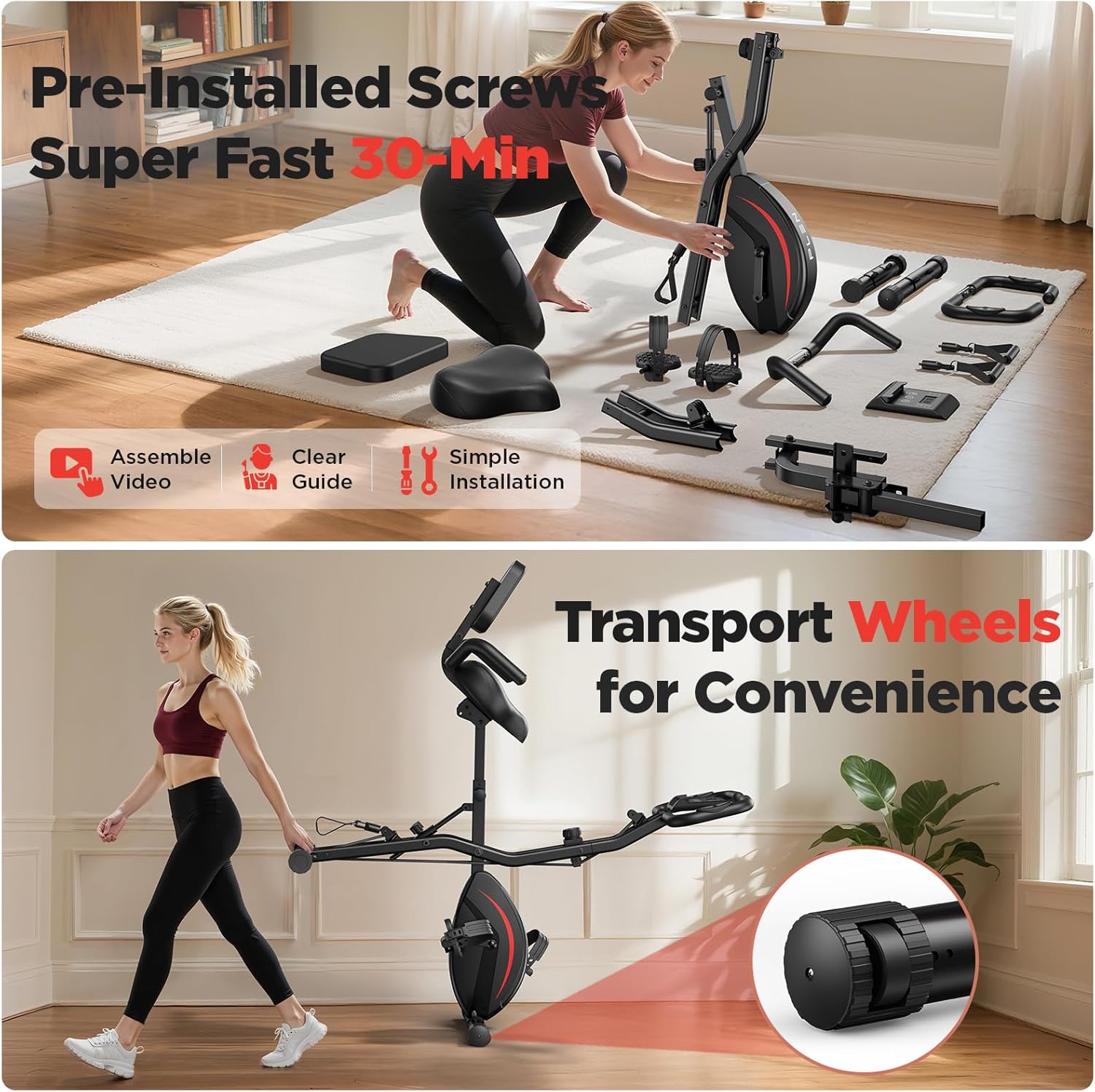 5 IN 1 DESIGN: Foldable exercise bike combines multiple exercise modes in one, supporting high intensity fat burning, low intensity stretching and strength training. Equipped with resistance bands for rowing and stretching. You can easily realize all-round workout goals at home.