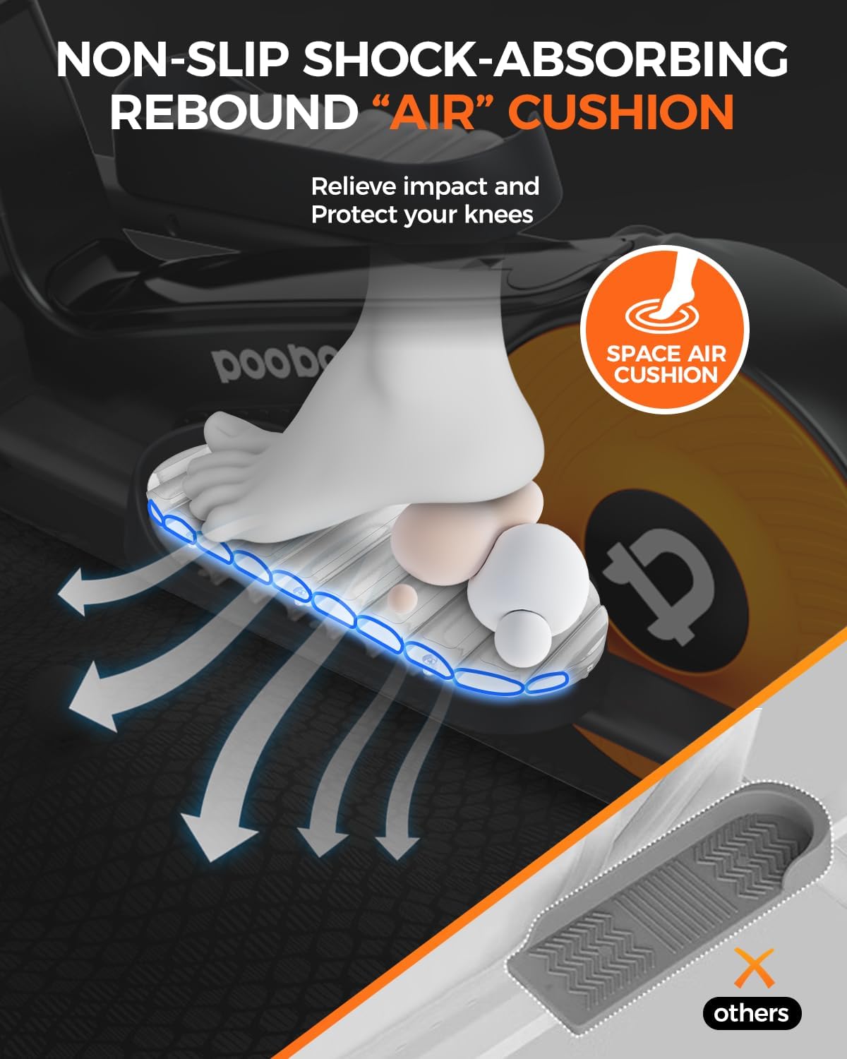 Hyper Quiet Magnetic Rear Drive System:The pooboo E399 elliptical features a smooth and natural motion provided by a quiet magnetic drive system. The Rear Drive combined the heavy 16 LB flywheel allows the center of gravity to shift back for safer and easier workout. Functions in both forward and reverse motion. Control the sound at 20 DB, your workout will never disturb your neighbors or family, just enjoy a peaceful and effective exercise in your own home