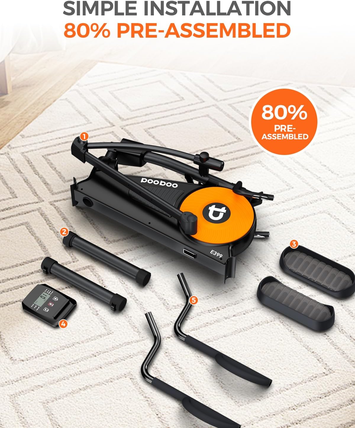 Warm Tips: The pooboo elliptical machine designed 80% pre-assembled. Say goodbye to the traditional complicated setup process. Guided by the manual or assembly video, you can easily finish it within 30 minutes. Besides, when not in use, it can be quickly and easily folded up