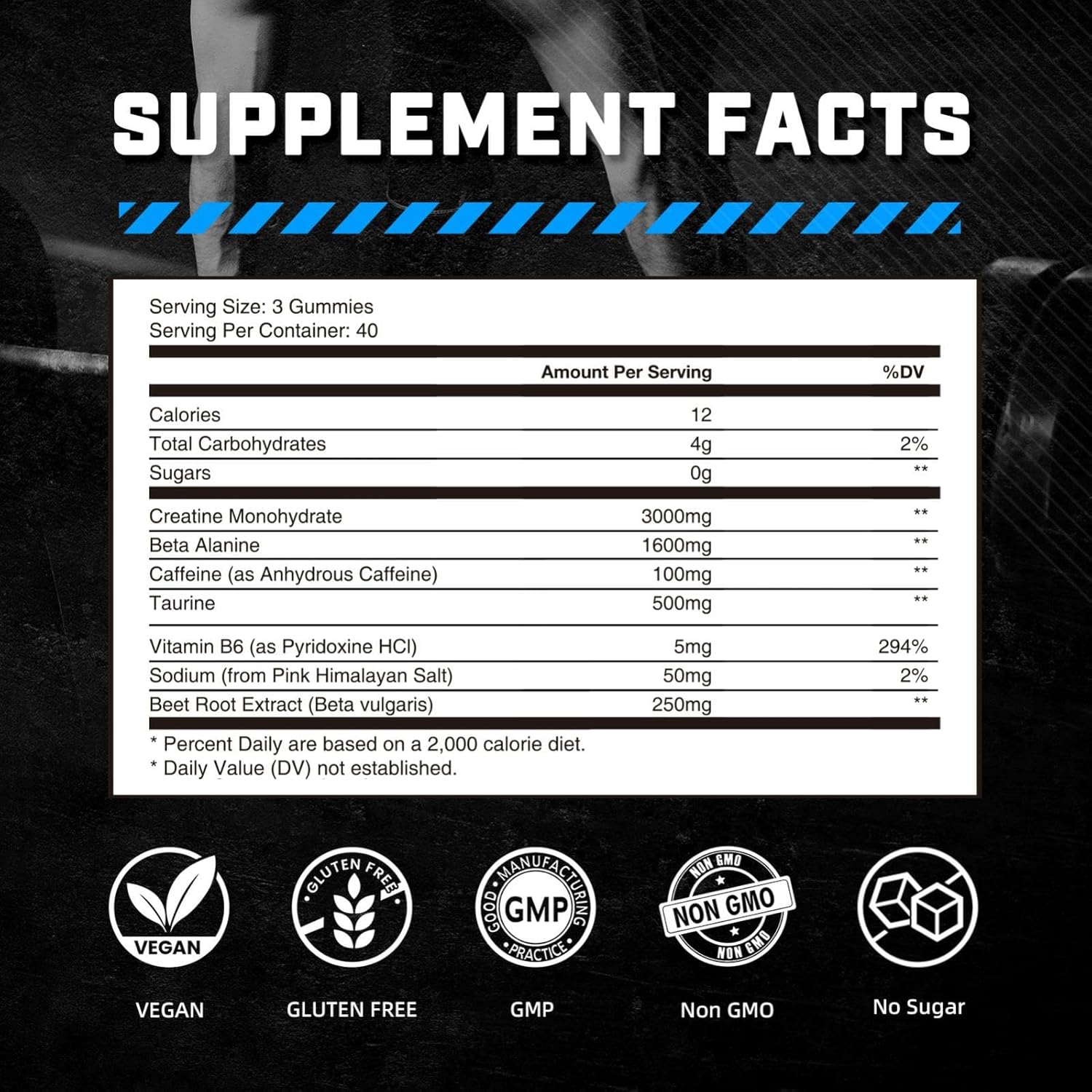 Powerful Pre Workout Ingredients:Our pre-workout gummies feature a blend of powerful ingredients to boost workout performance. Creatine Monohydrate enhances strength and endurance, while Beta-Alanine increases sport ability and reduces muscle fatigue. Taurine supports muscle function and recovery, and Beet Root improves health circulation and oxygen delivery.