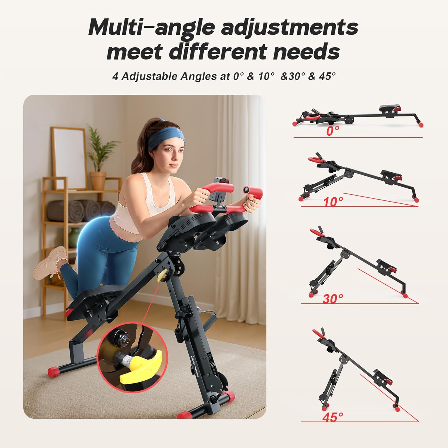 【Adjustable Row Machine】This versatile rowing machine for home features 4 adjustable height positions from 4’4″ to 6’6″ and 4 angle settings at 0, 10, 30, and 45 degrees, letting you tailor it to your body type and workout intensity. Ideal for all fitness levels, this foldable rower machine empowers you to sculpt your core and build your ideal physique through highly efficient abdominal workouts!