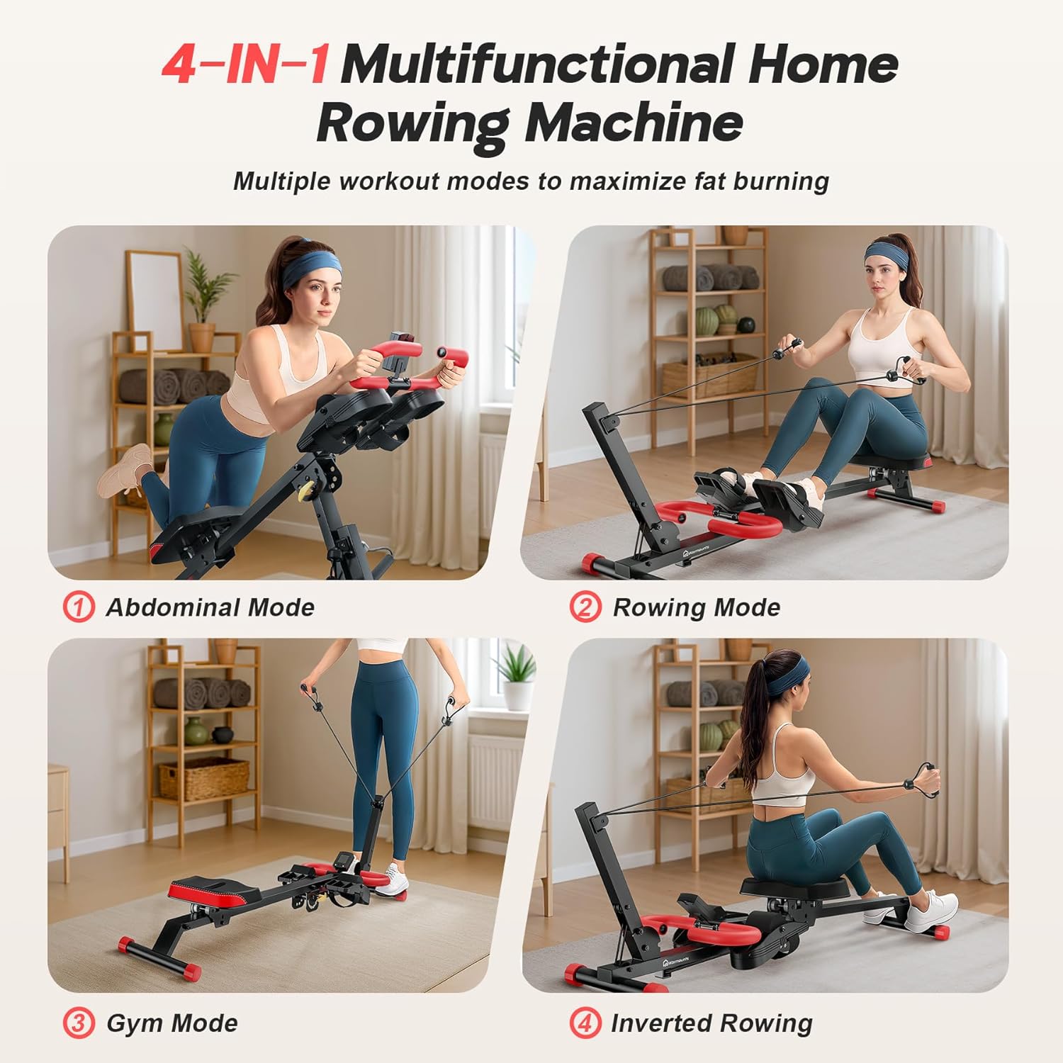 [Total Body Sculpting & Fat Burning] 4-in-1 Rowing Machine delivers rowing, abs sculpting, gym training, and inverted rowing modes. Easily switch between workouts to transition from cardio rowing to core sculpting while simultaneously toning arms, core, legs, back and targeting abs for 360 degree muscle engagement. All delivering gym quality results at home.