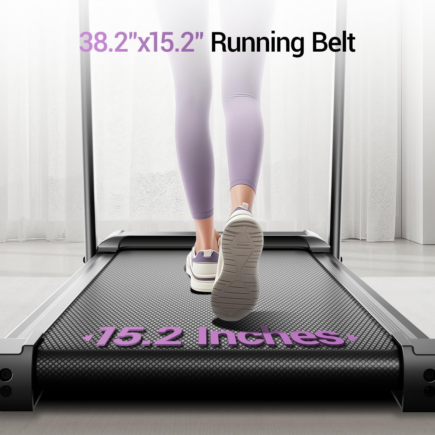 Spacious Running Belt: 38.2“ x 15.2” Running belt is equipped with 6 layers of non-slip surface, cushioning rubber pads and silicone shock absorbers, the running belt will not shift to ensure a smooth and comfortable run, absorbs shock generated during running, reduces impact on joints and muscles, extends the duration of the workout, and improves workout results