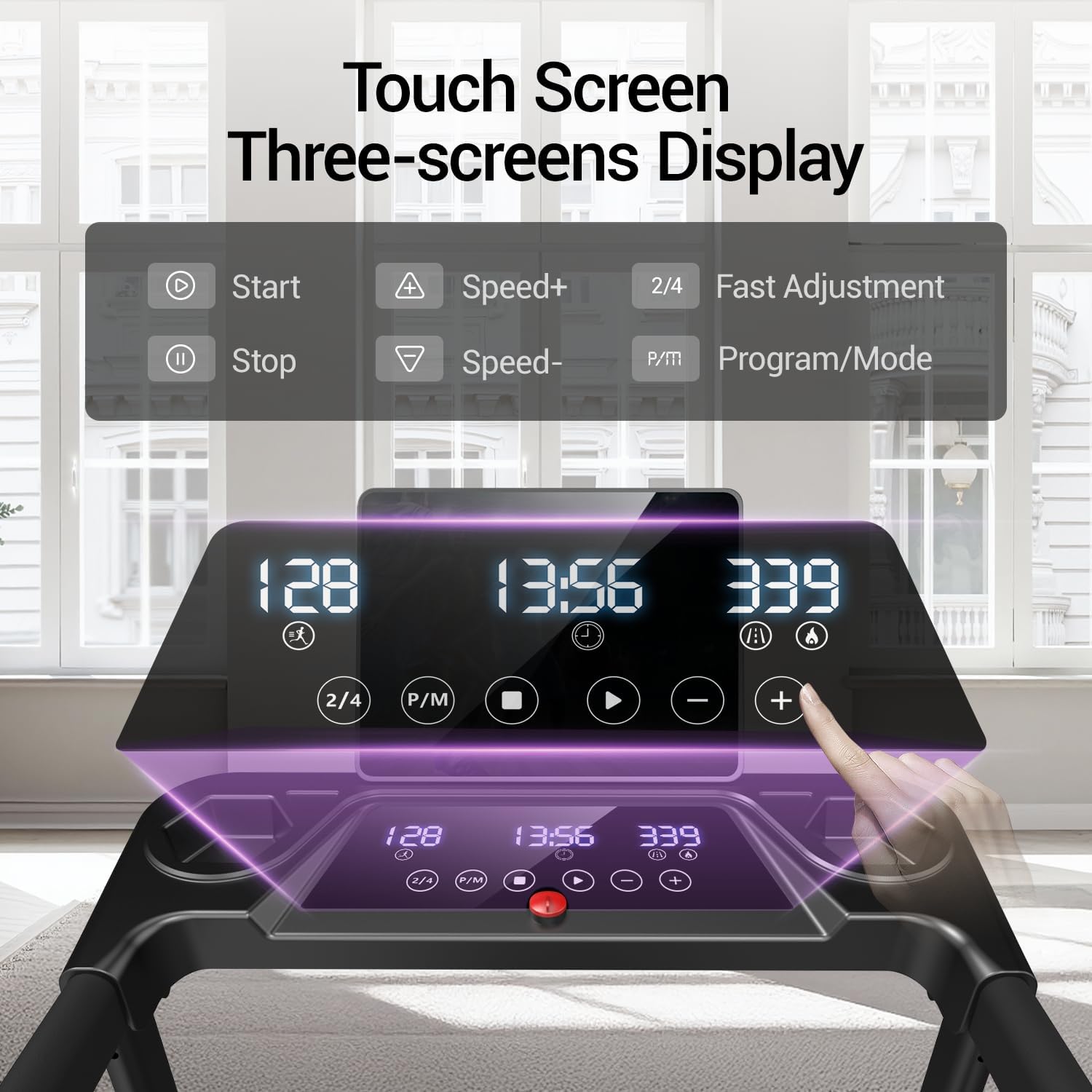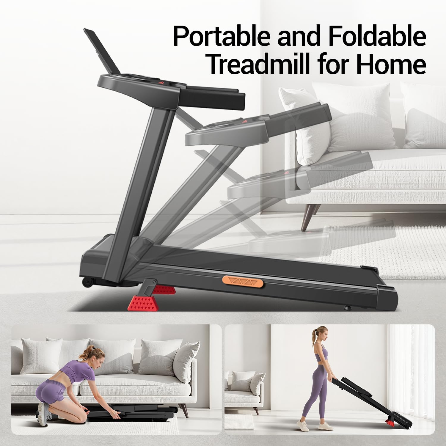 3-Screen Display & Foldable Design: This treadmill with handles features a triple display that shows time, speed, distance, and calories burned in real time and allows you to improve and adjust your workout program at any time with buttons on the display. This foldable treadmill has a built-in water cup holder and tablet/cell phone holder, making it easy for users to place their belongings while working out