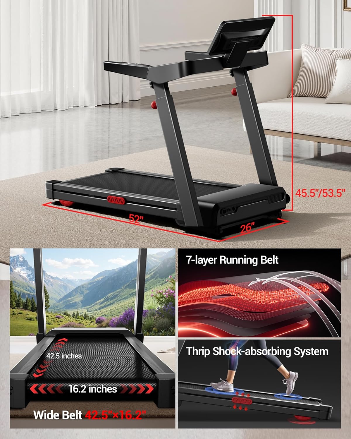Height-Adjustable for Full Family Use Customize the deck height from 45.5″ to 53.5″ to suit every user. With a 16.2″ x 42.5″ belt and speeds from 0–8.7 MPH, it’s ideal for beginners, seasoned runners, and everyone in between.