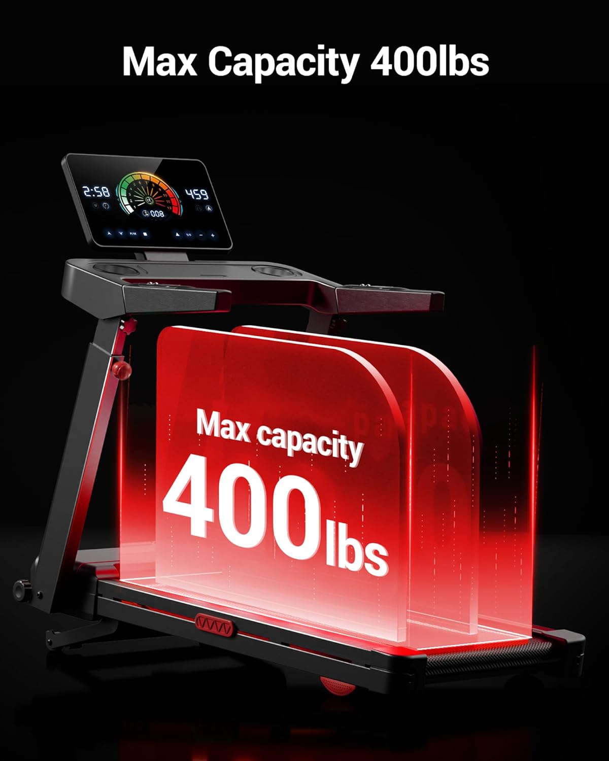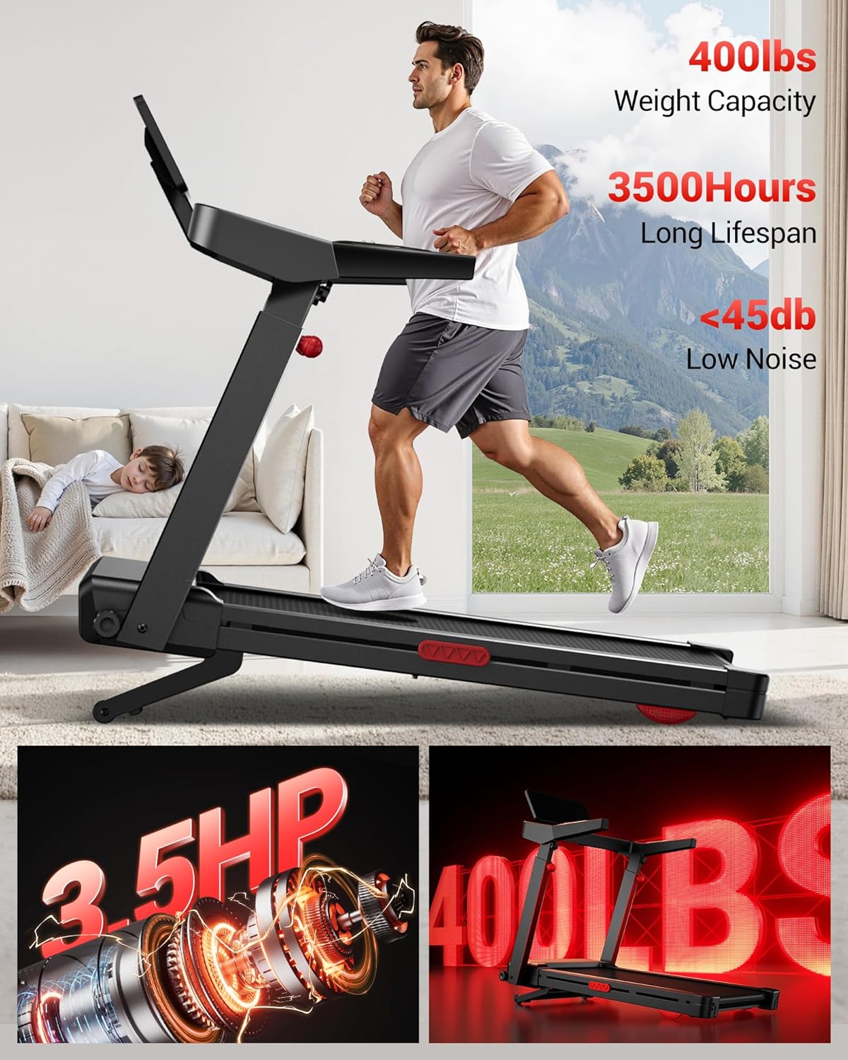 Quiet 3.5HP Motor & 400lb Capacity:Engineered for powerful, whisper-quiet workouts (<45dB). The 3.5HP brushless motor and 7-layer cushioned deck support up to 400 lbs, making it one of the best treadmills for home 350+ lbs weight capacity.