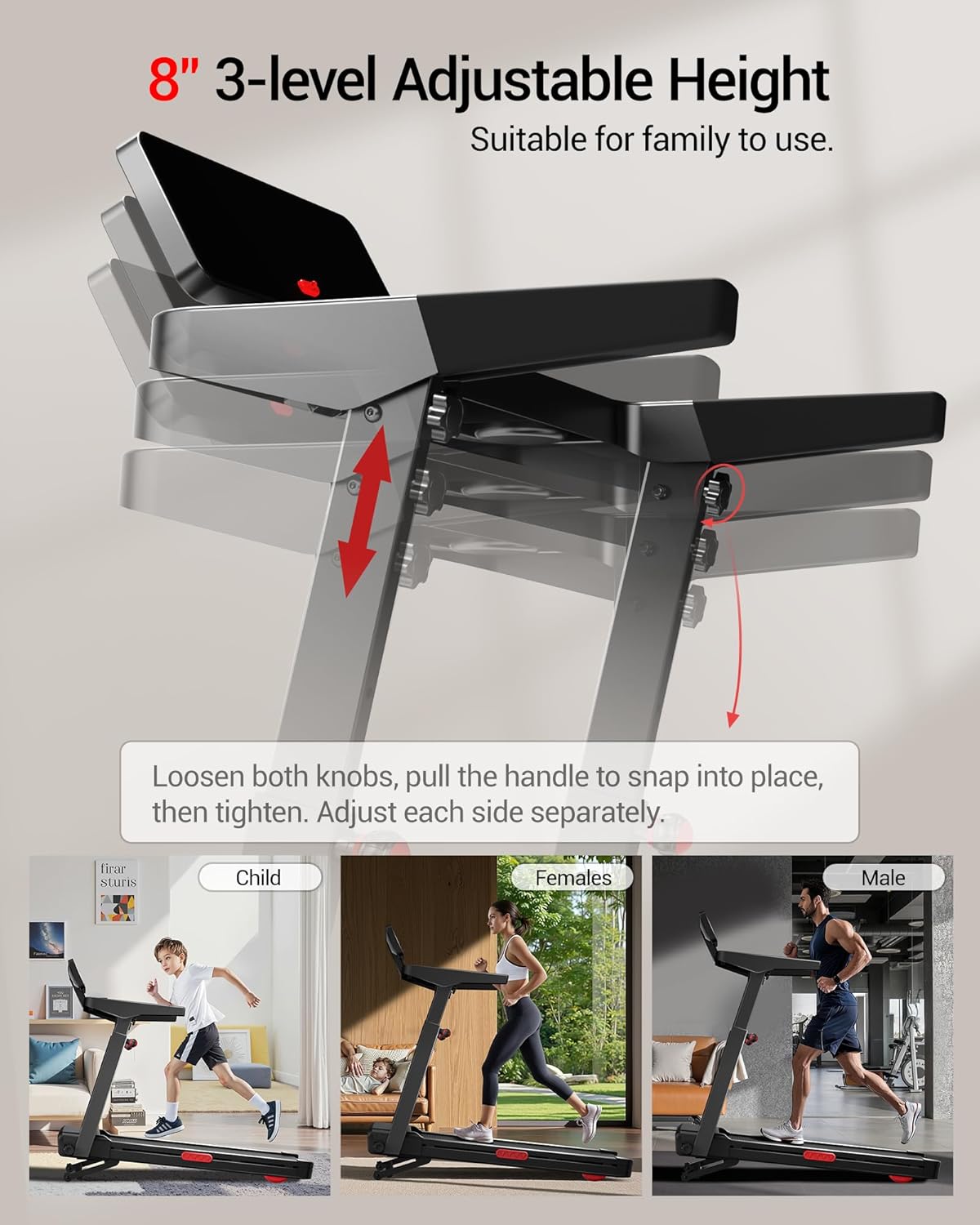 Height-Adjustable & Full Family Use:Customize the deck from 45.5″ to 53.5″. With a 16.2″ x 42.5″ belt and speeds of 0-8.7 MPH, it’s a versatile walking treadmill and running treadmill—great for all ages and fitness levels!
