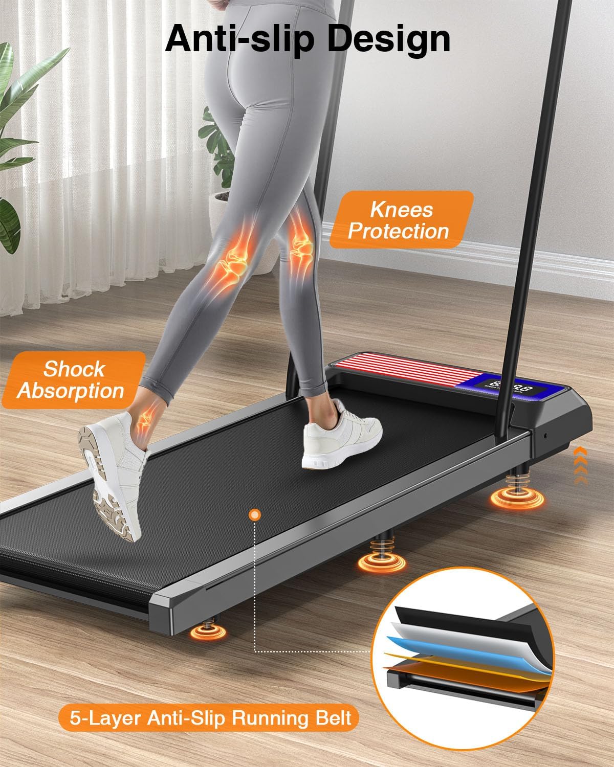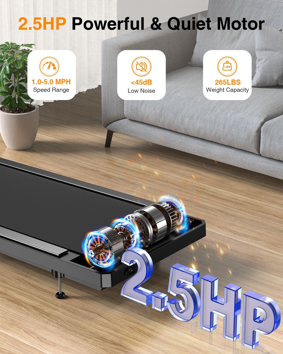 【Powerful & Quiet Motor】2.5HP motor supports 265 lbs and reaches 5.0 MPH. This walking treadmill pad runs quietly, letting you work out without disturbing family or coworkers.