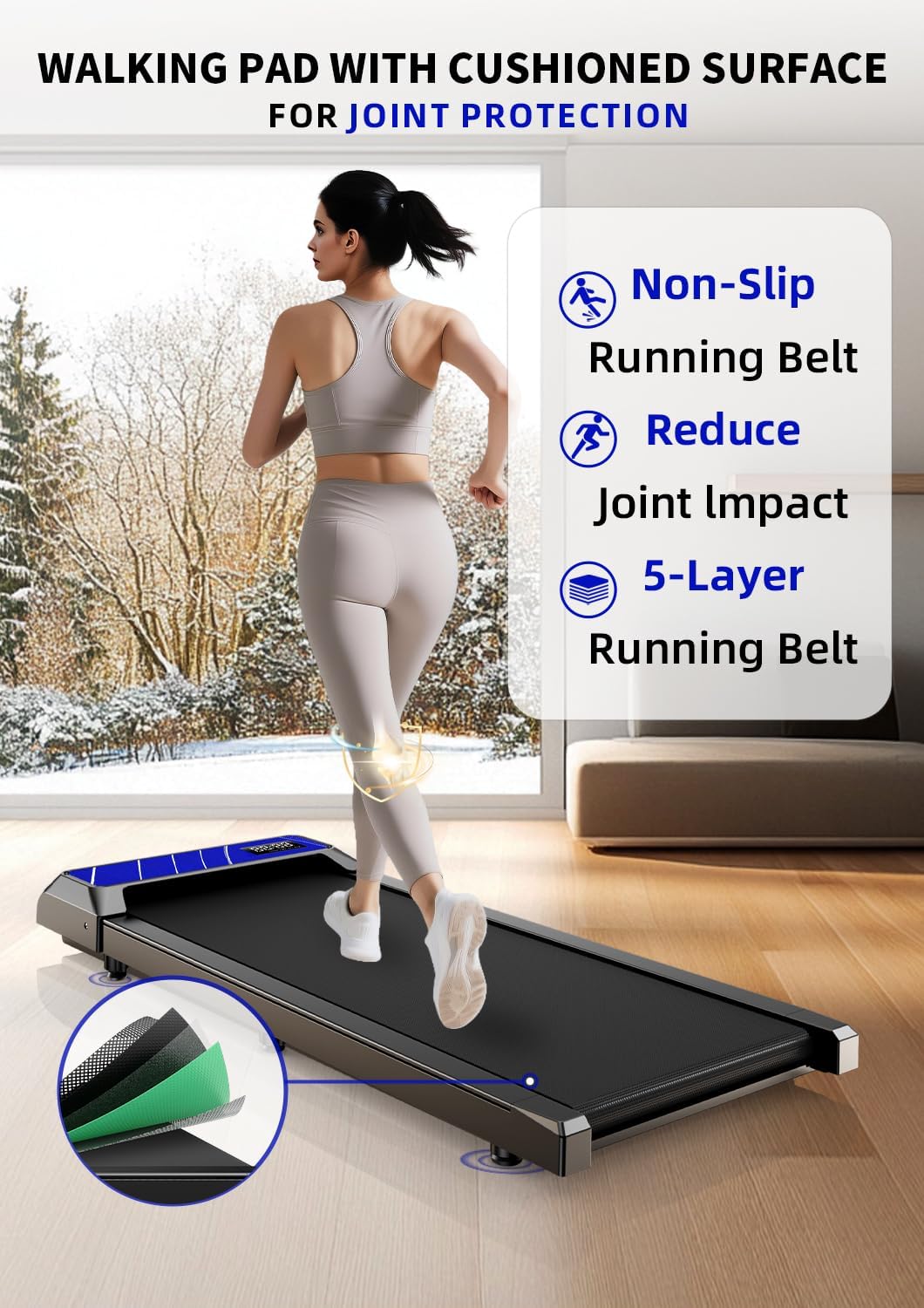 Comfortable, Quiet Workouts: 5-layer anti-slip belt minimizes noise and impact on joints. This incline walking pad ensures safe, stable steps while protecting knees and muscles.