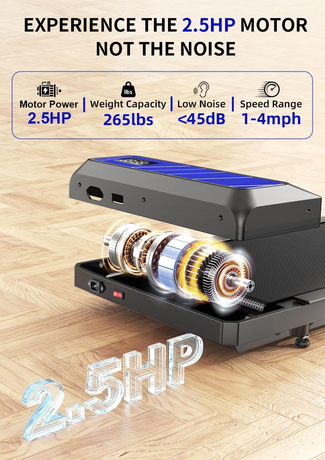 Powerful & Efficient Performance :2.5HP brushless motor supports up to 265 lbs. The 5% incline boosts calorie burn while running quietly, perfect for home or office use.
