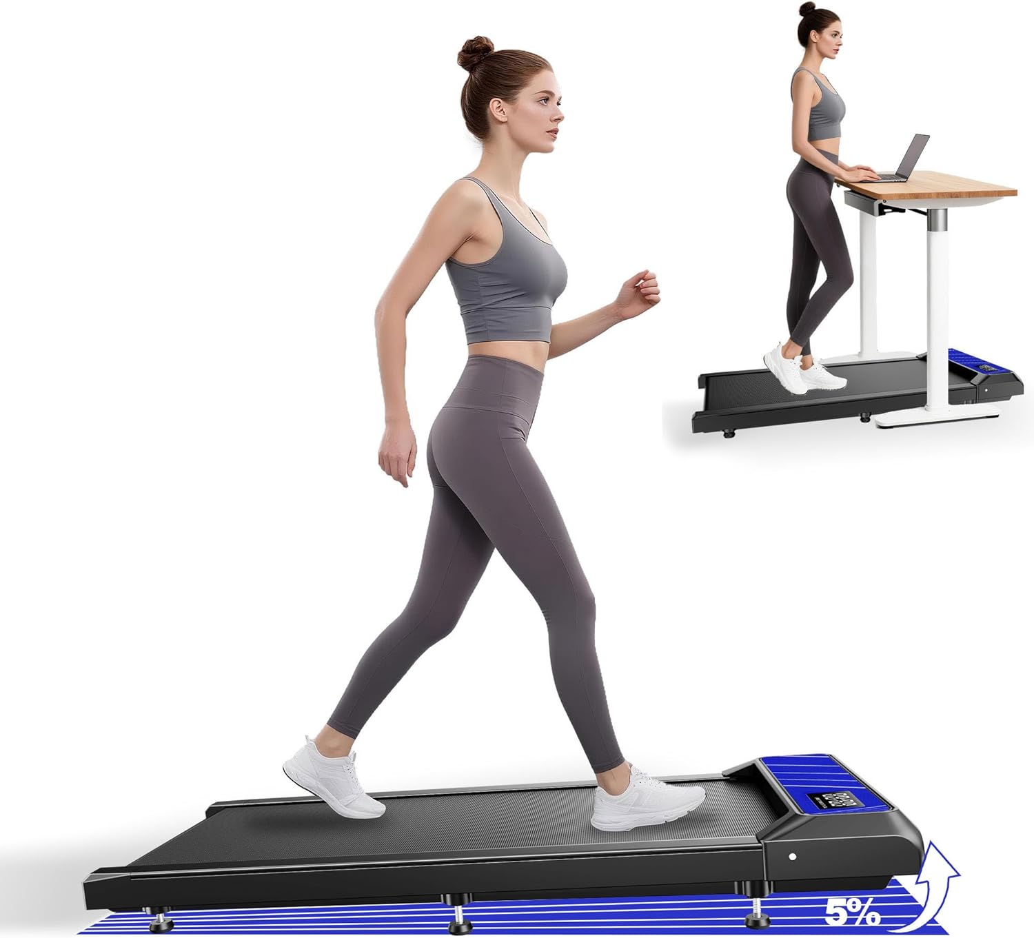 Upgrade your daily routine with this space-saving treadmill—perfect for office or home use. With 3% & 5% incline options and speeds from 1–4 mph, it transforms from an under-desk walker to a light jogger or runner in seconds. Stay active, burn calories, and boost productivity—all without leaving your workspace.