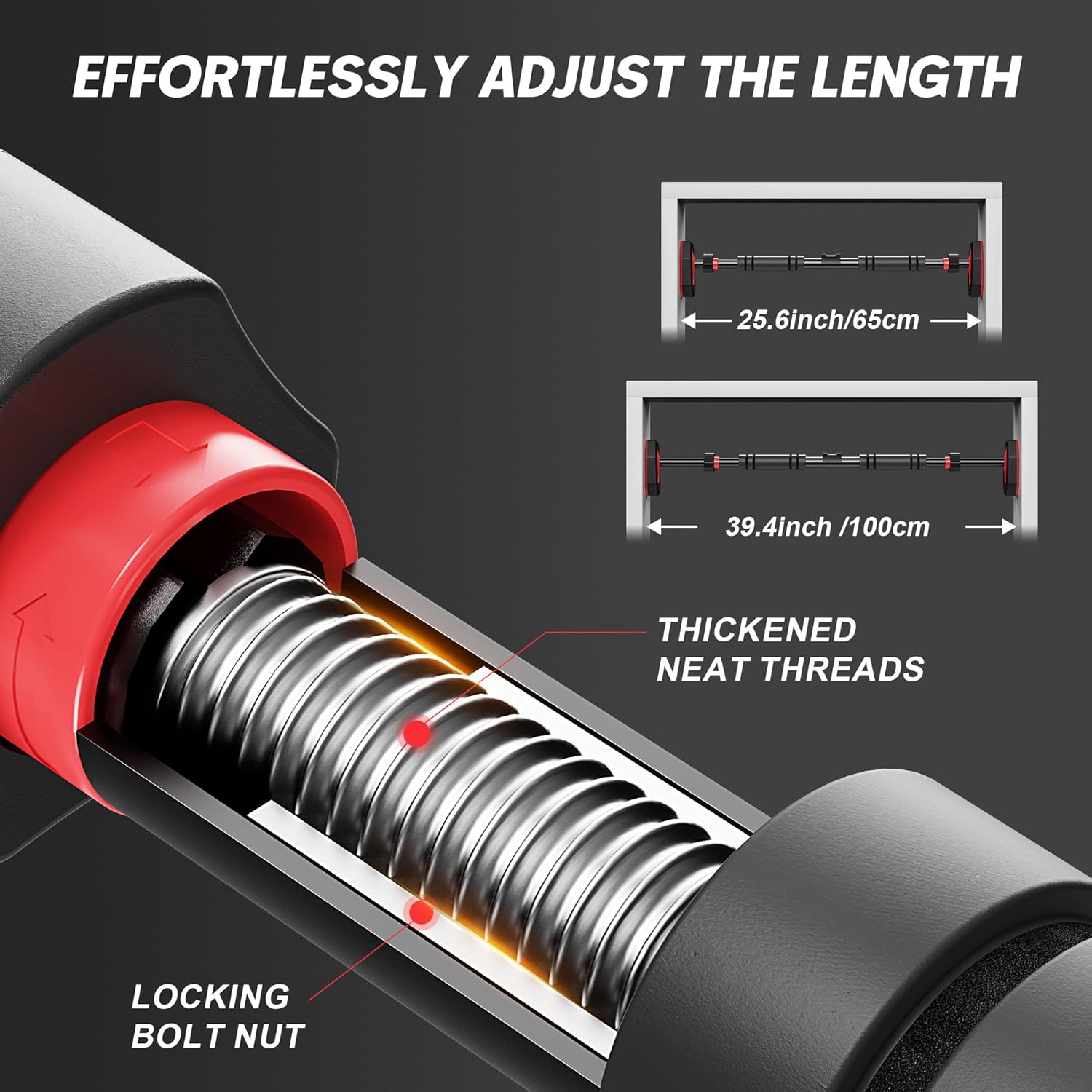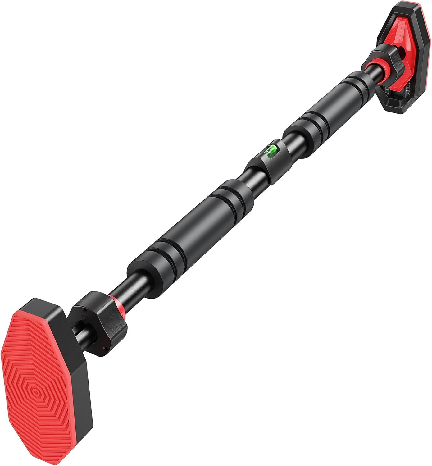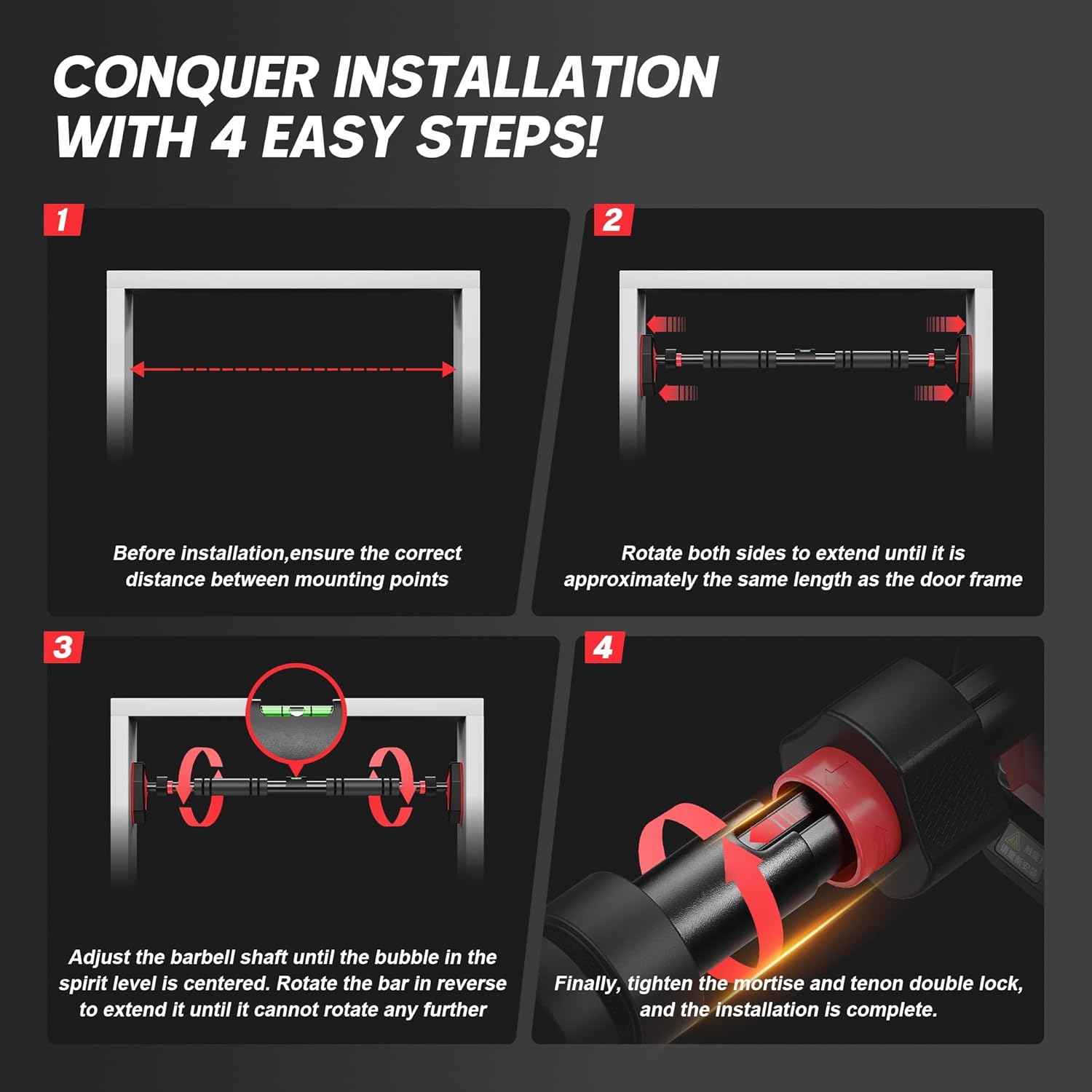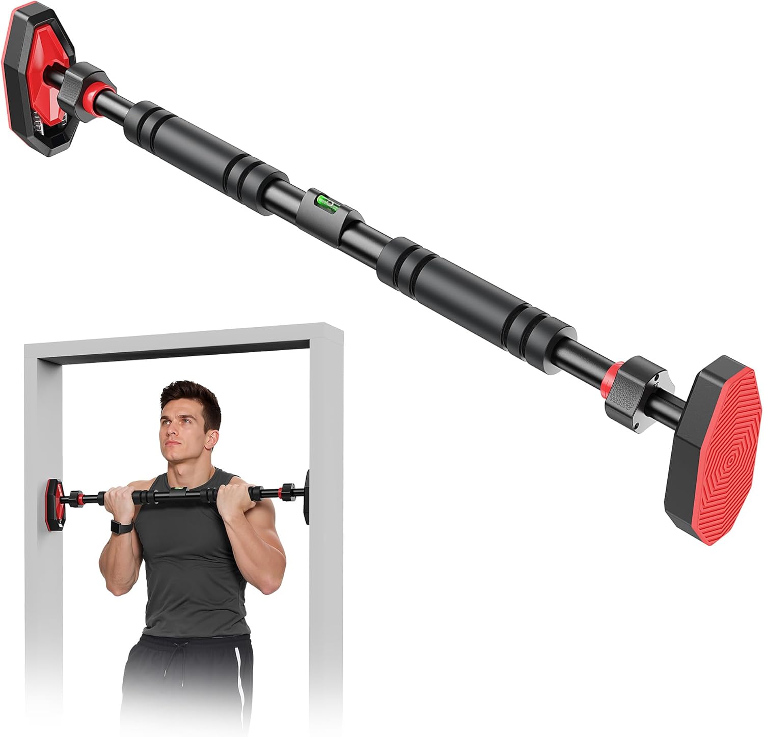 Our chin up bar doorway with Embedded thick-threaded telescopic rod allows No tools required, one-twist locking. Wide 65-100cm (26-39 inch) adjustment fits virtually all standard doorways (24-40 inches). Built-in bubble level ensures optimal leveling – installs or removes in seconds.